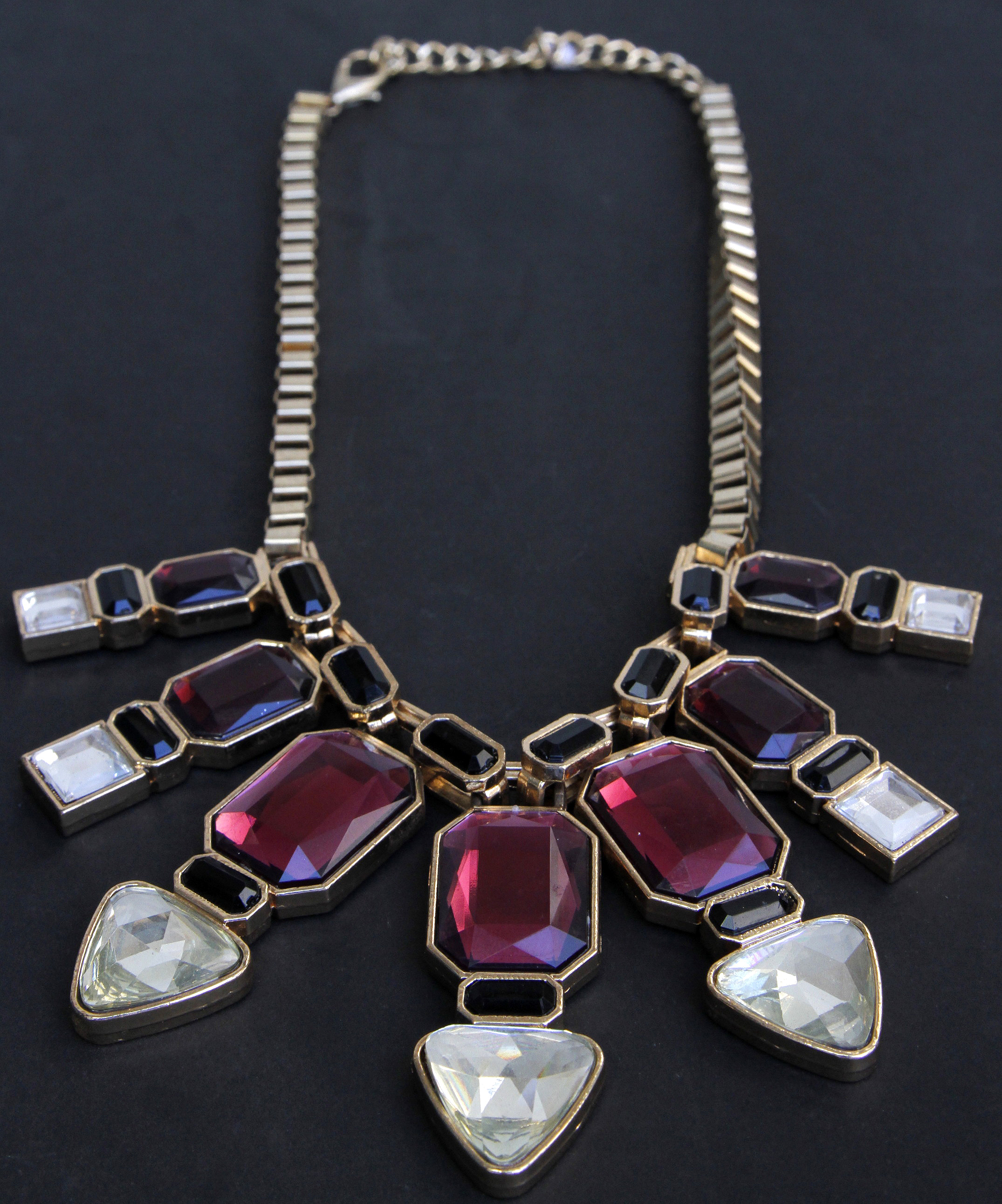 Collar corto de metal con strass tricolor ($450).