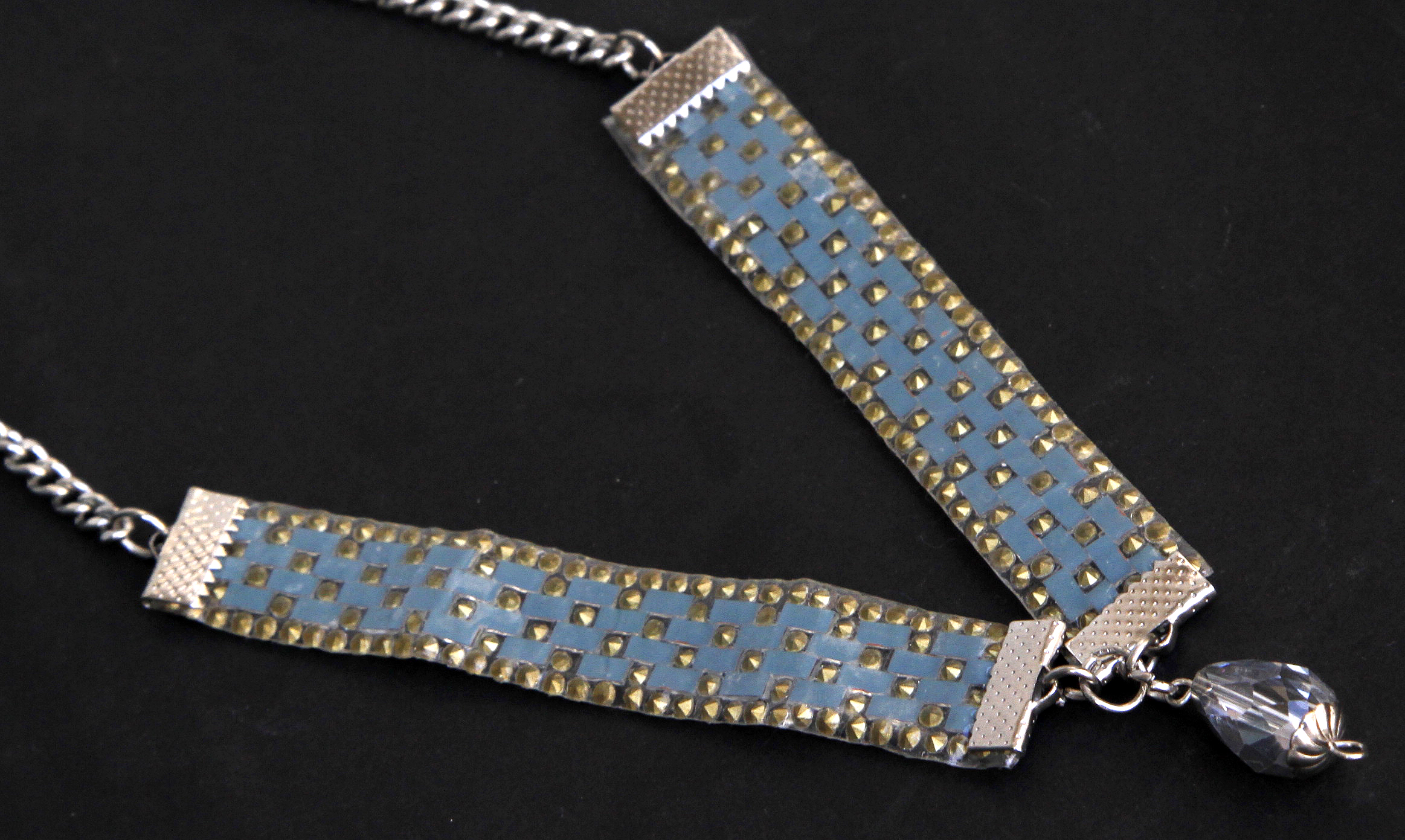 CHOKER DE STRASS CON COLGANTE DE VIDRIO ($220).