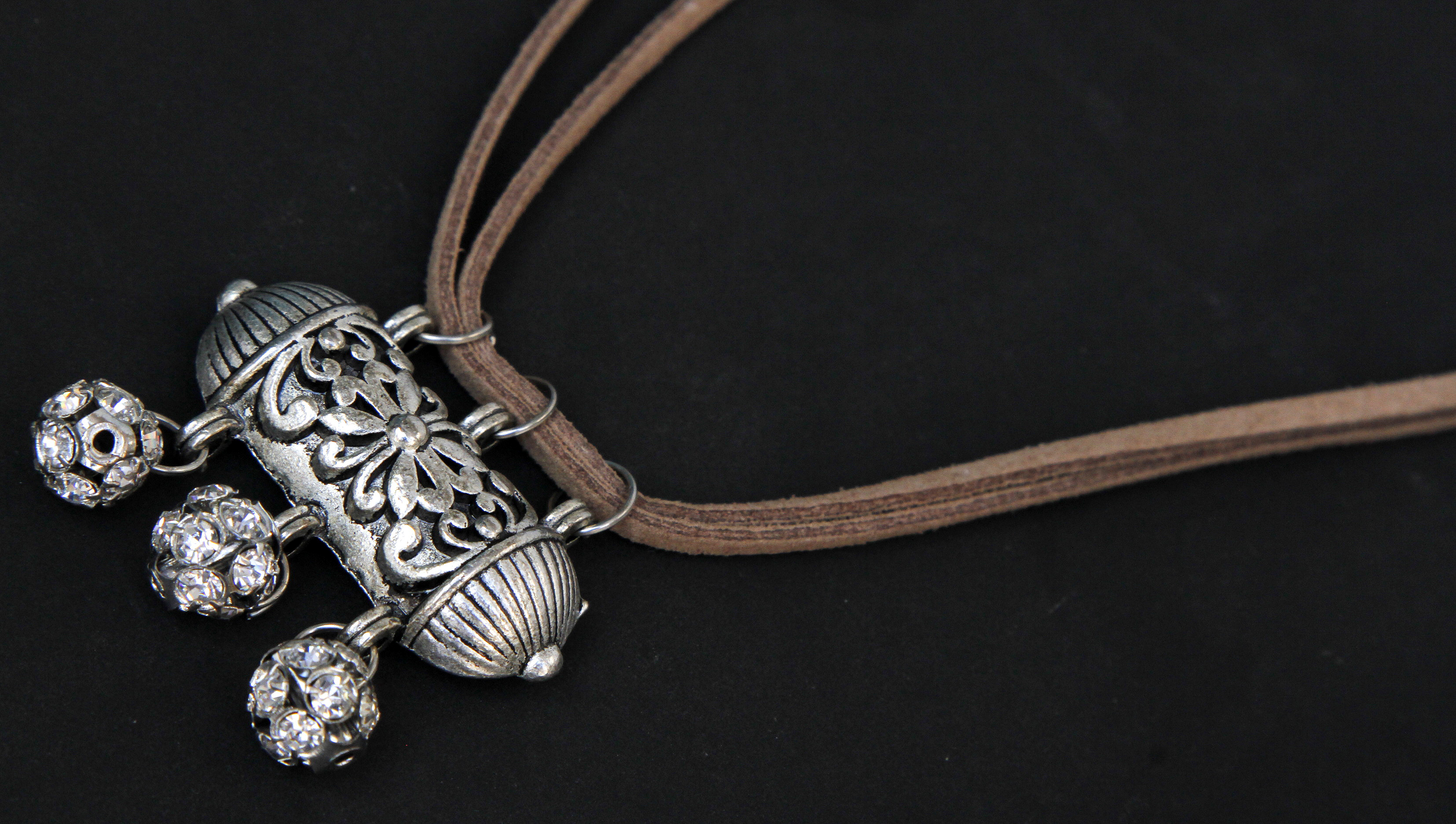 COLGANTE DE GAMUZA CON PIEZA CENTRAL DE METAL CON BORLAS DE STRASS ($220).