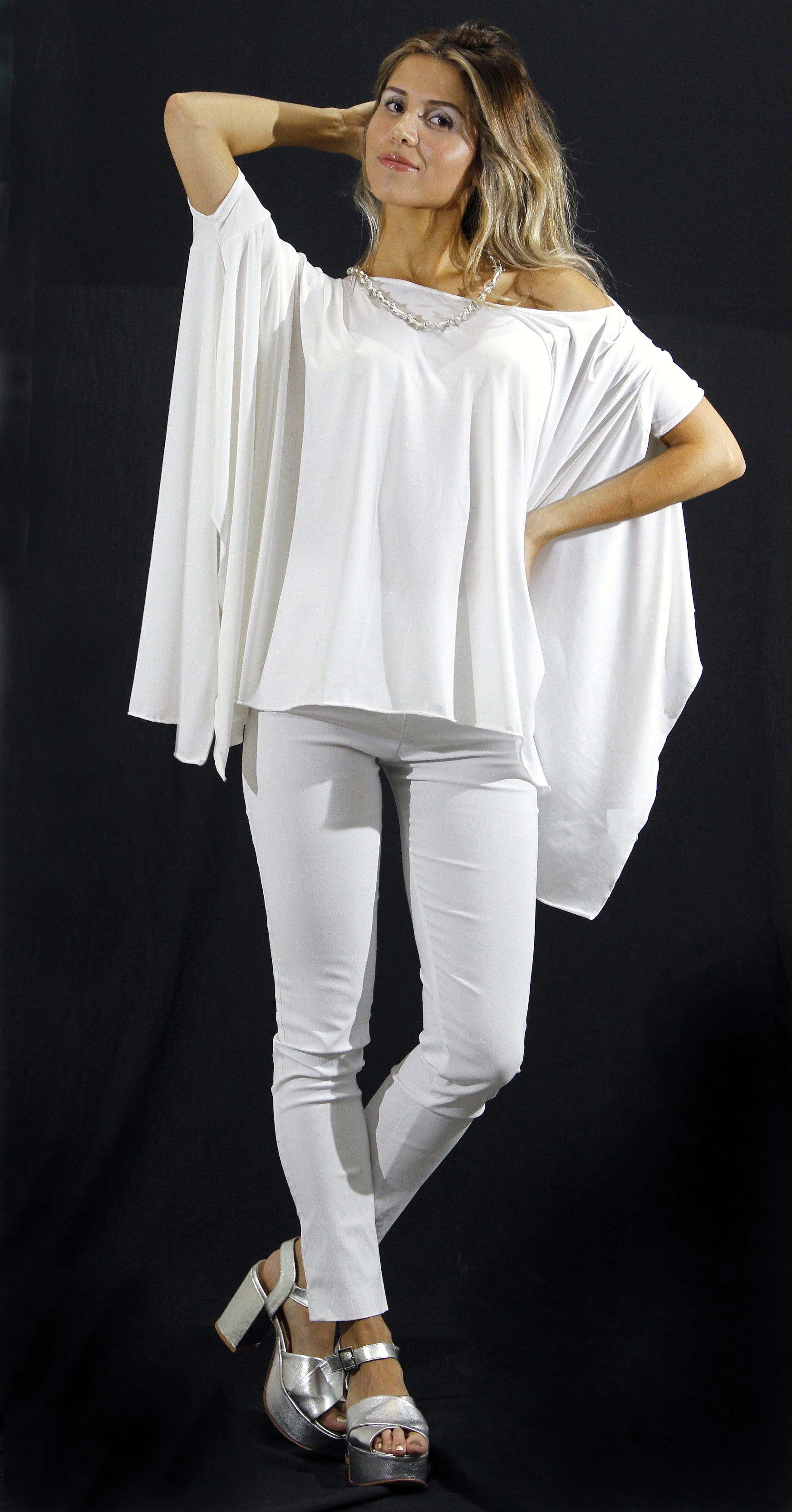 Chupín de shantung con spándex cintura alta ($1.200, Pájaro), con un poncho con cuello bote y mangas de lycra de seda ($890, Be Blessed) y unos suecos cruzados con plataforma alta, taco ancho y pulsera ($1.990, Company). En el cuello un collar multifunción de gamuza y metal ($290).