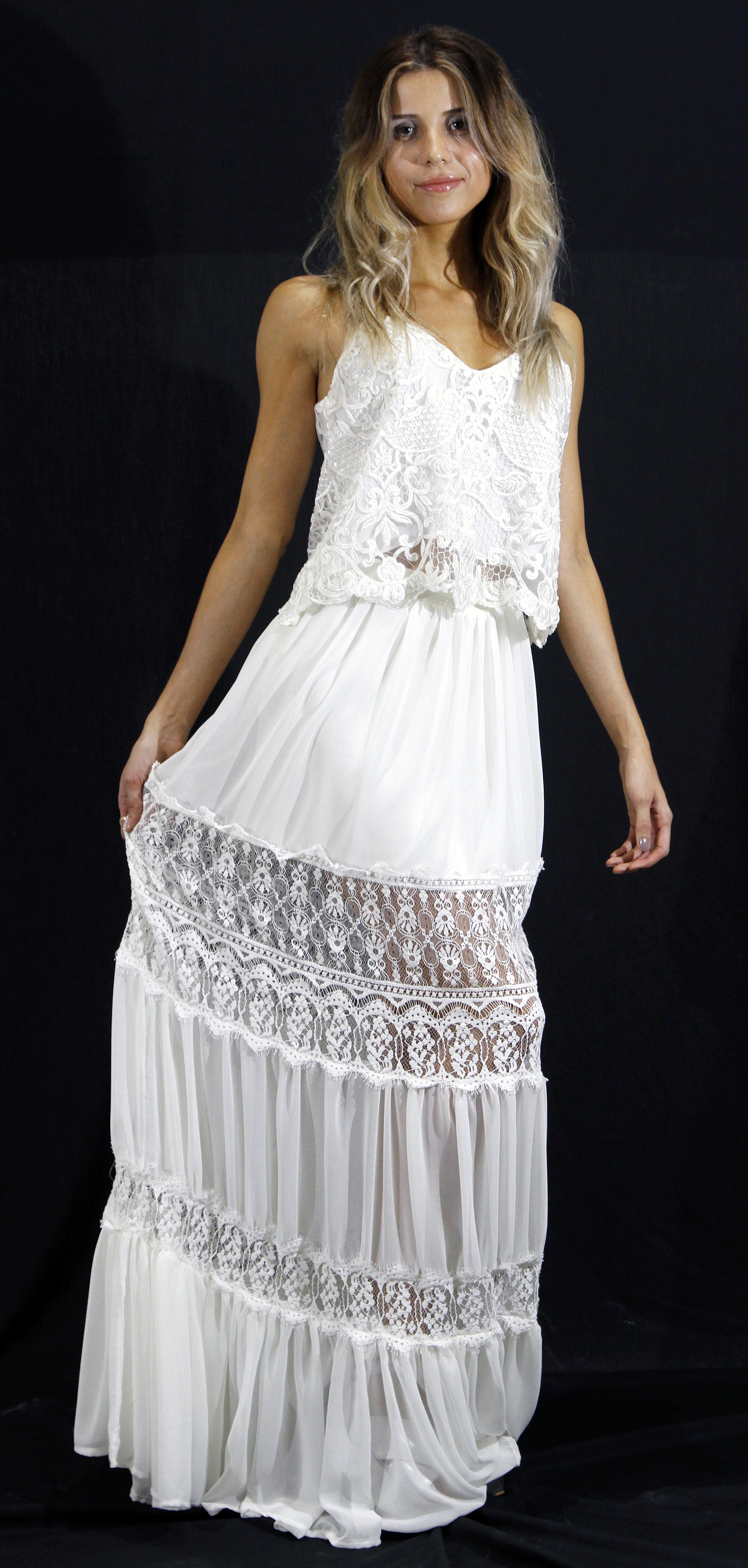 Maxi falda de muselina y encaje ($1.400, Portsaid), con un crop top también de encaje con hilos metalizados ($2.380, Pájaro).