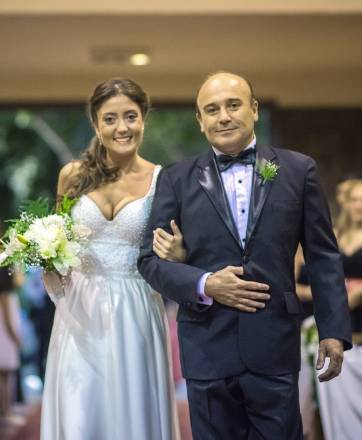 El vestido nupcial fue diseñado por Florencia Tornello, con el peinado de Diego Narváez y maquillada por Alejandra Ortiz.