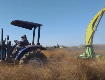 Le consultamos sobre la máquina y agregó "es una segadora de alfalfa, tiene dos cuchillas de eje propio. Con una turbina (cuello de cisne) que libera o deposita el corte (chipeado) según donde sea necesario, a un costado, atrás en un carro. Esto permite sacarlo del campo o potrero y realizar un compostado de la misma. Trabaja con la toma de fuerza del tractor, acoplado con el cardan."