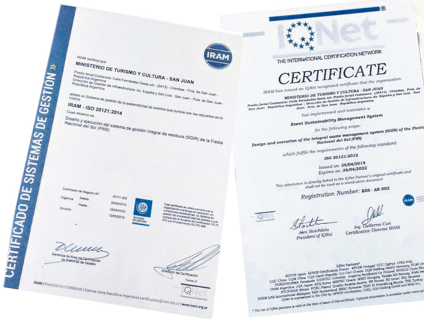 Y vaya si no es compromiso que en la última feria temática de la FNS -la del 2019- se logró certificar las normas que rige el Instituto Argentino de Normalización y Certificación (IRAM) para todo evento sustentable, las ISO 20121. Así, San Juan se convirtió en "el primer evento "limpio" de toda Latinoamérica", según asegura Facundo Rodrigo, el Director de Gestión de Infraestructura del Ministerio de Turismo y Cultura, quien estuvo encargado de ese proceso de hacer menos contaminante un evento tan masivo. Entonces se recolectaron 10 toneladas de basura y de ese total un 85%, según los registros que cuantificó y valoró Iram, pudo ser reciclado.
