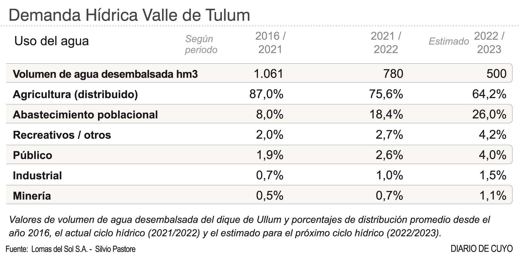 Los porcentajes de uso del recurso para cada sector "se han estimado tomando como fuente de información los consumos de la provincia de Mendoza, el de la República de Chile y los datos locales de publicaciones o notas periodísticas de las reparticiones públicas -ver infografía-, con el promedio de consumos para los años 2016 al 2021, la variación de los porcentajes para el corriente ciclo 2021/2022 y su proyección para el próximo año, considerando las restricciones -coeficientes de distribución y días de corta- que el Departamento de Hidráulica aplica a la distribución de agua para riego".