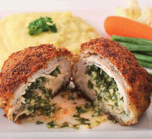 Es la pechuga de pollo deshuesada enrollada alrededor de un trozo de mantequilla de ajo que se empana y se fríe u hornea. Esta forma de preparar el pollo probablemente no tenga origen ucraniano, como sugeriría el nombre de Kiev, su capital. El historiador gastronómico ruso William Pokhlebkin afirmaba que la receta fue inventada en el Merchants Club de Moscú a principios del siglo XX y fue bautizada pollo Kiev (kotleta po-kievski) en algún restaurante ruso años después.