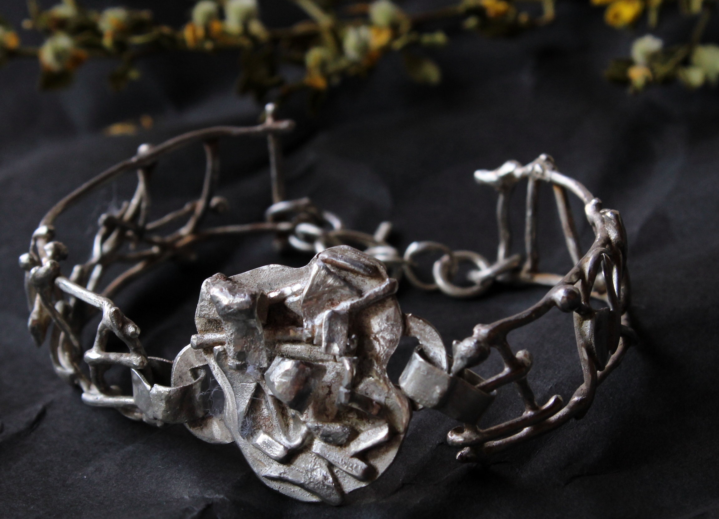 Federico, más cercano a la escultura y a la manipulación de elementos, como por ejemplo una serie de "Objetos perversos", denominados así porque les cambia su forma para volverlos inútiles, como por ejemplo una tetera con el pico al revés, se acercó a la orfebrería para enriquecer esta propuesta. "Siempre me gustó, en particular el trabajo de Víctor Nobre. Me anoté en un curso que dictaba Lorena Gómez Luluaga con la intención de ver si me servía esta técnica para estos objetos más escultóricos que algunas veces hacía. No fue con la intención de hacer anillos, collares o pulseras, pero me fui entusiasmando y metiendo por ahí", cuenta Fede.