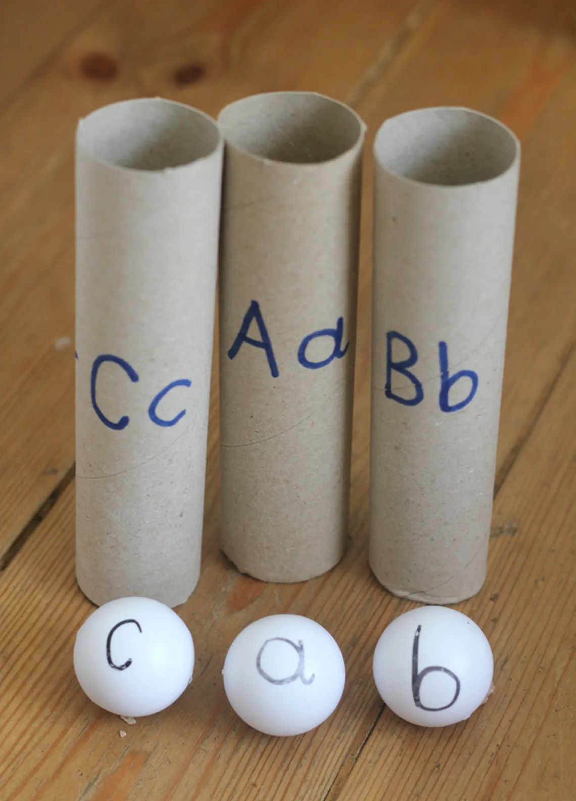 Elige unas cuantas bolas blancas o de ping pong y un tubo de cartón por cada letra del abecedario. Escribe una letra del abecedario en cada bola y luego haz lo mismo con cada tubo. Comienza a jugar con tu niño: tú dirás una letra y él tendrá que escucharla (para practicar el fonema) y meter la bola en su correspondiente tubo.