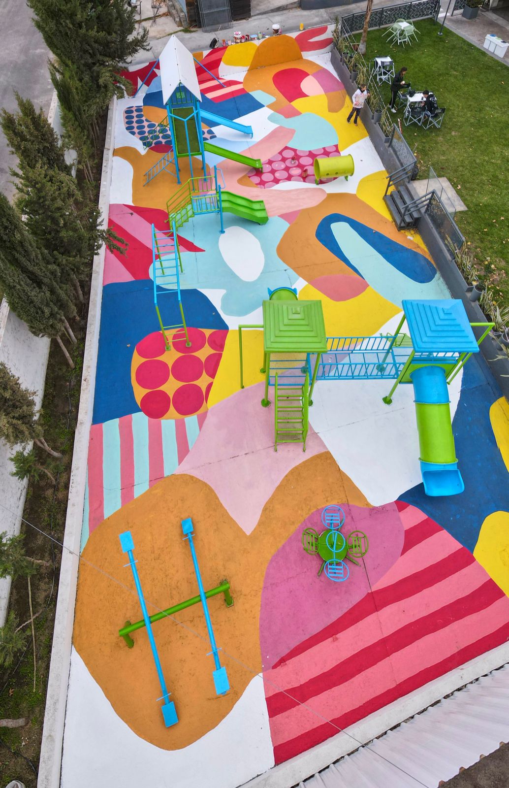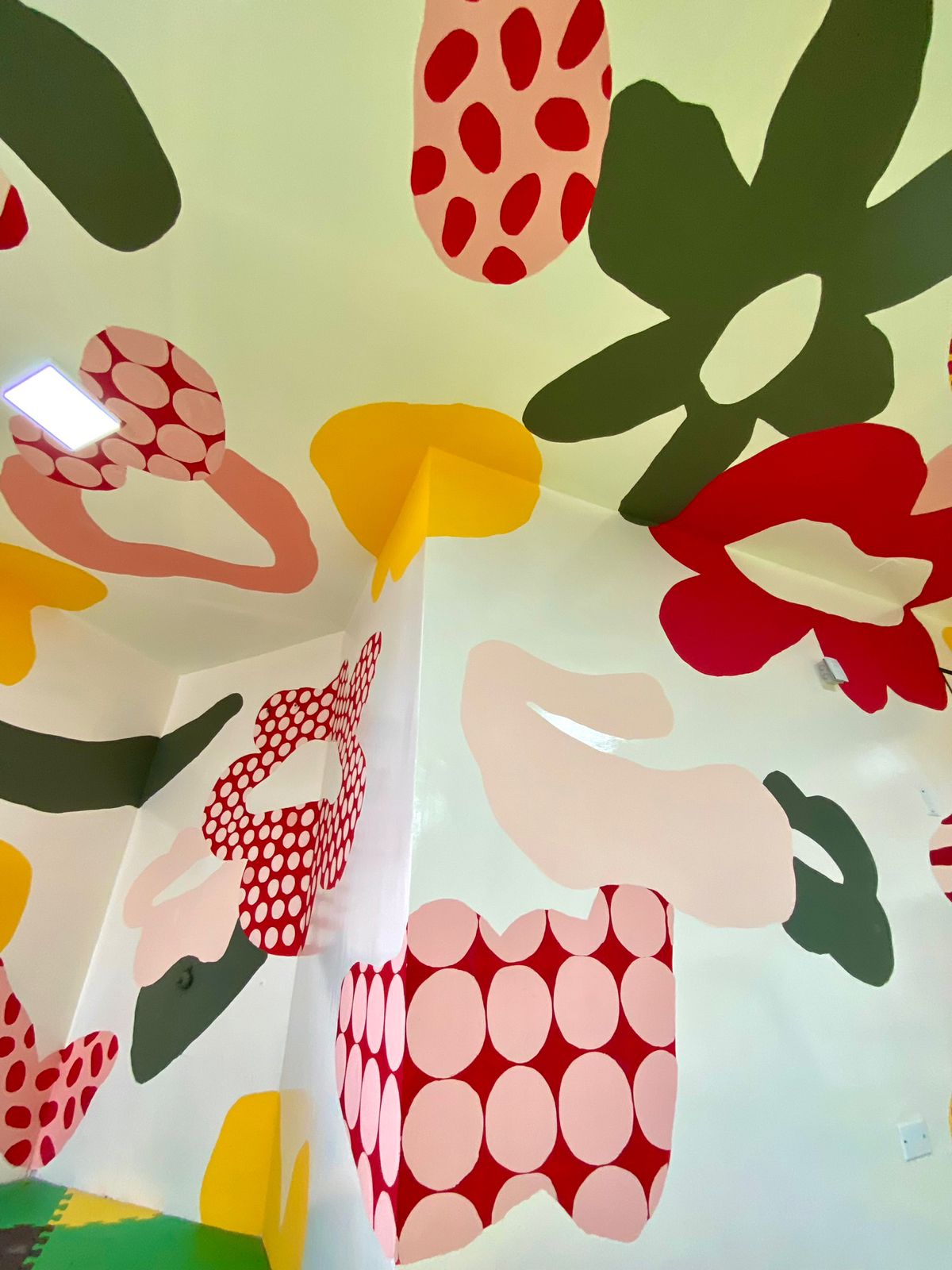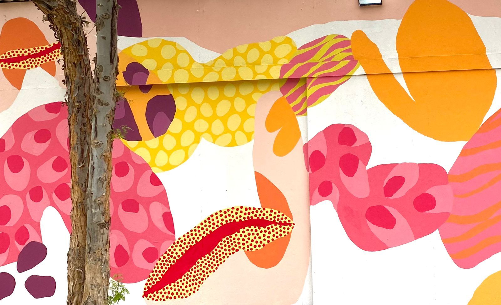 Puedo decir que el estilo de los murales que he ido formando está compuesto por varias figuras geométricas, es bastante abstracto y se caracteriza por tener muchos colores y diferentes tramas y texturas. Son formas simplificadas basadas en formas orgánicas o geométricas. Mis diseños siempre llevan un espíritu donde busco generar alegría y optimismo en el espacio en que se encuentra. No pinto pedidos personalizados, lo que realizo tiene que ver con mi estilo.