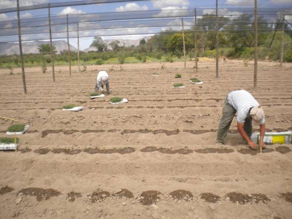 Por ello, destacó Fernando Mallea, coordinador de Jáchal, se seleccionaron 2 agricultores de APAG (Asociación de Productores y Ganaderos de Jáchal) con antecedentes en el cultivo, propietarios del terreno y visión de futuro, para allí instalar los equipos de goteo y las mallas antigranizos. En nuestro caso, quedaron por sus méritos demostrados con anterioridad Carlos García y Ramón Villafañe, sus fincas quedan en Pan de Azúcar y en San Isidro.