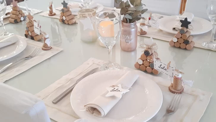 Acomodar los corchos para darle forma de pino, con una base de 4 corchos, encima 3, luego 2 y finalmente 1. Unirlos entre sí, con una gotita de silicona o pegamento. Dibujar una estrella con cartón, recortarla y pintarla con temperas o la pintura elegida. Pintar los corchos a gusto, con los colores de la vajilla, algún dibujo temático o sencillamente pintitas. Dejar algunos con su color natural. Pegar la estrella y terminar con un moño de cinta o cordón para dar un acabado prolijo. Estos arbolitos se pueden distribuir a lo largo de la mesa, al frente de cada plato.