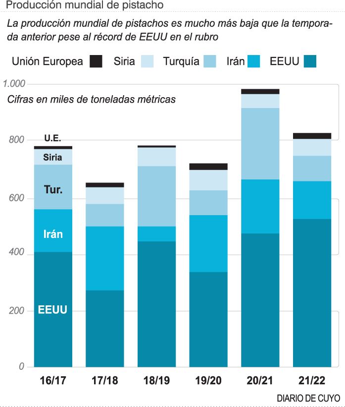 Según el estudio, "la producción mundial de pistachos para 2021/22 desciende un 16%, hasta las 829.000 toneladas, debido a los descensos en Irán y Turquía, que contrarrestarán con creces el continuo repunte en Estados Unidos. Como resultado de una menor oferta disponible, se espera que el consumo mundial, el comercio y las existencias finales se reduzcan".