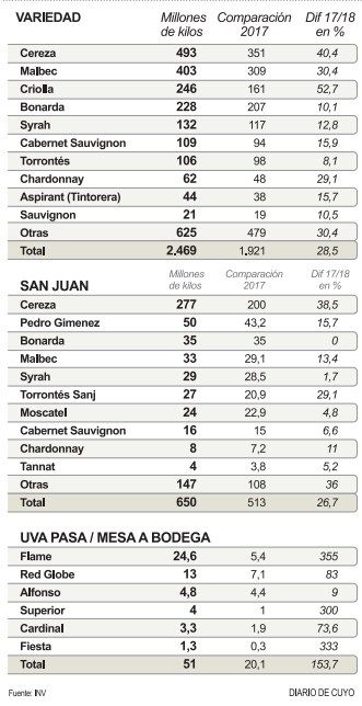 La uva a bodega creció por el repunte en las variedades comunes, 52% en Criollas y 40% en Cereza. En San Juan el alza se debió a Cereza en un 38,5% y a un 153% de uvas para pasas que por precios bajos se destinaron a mosto.