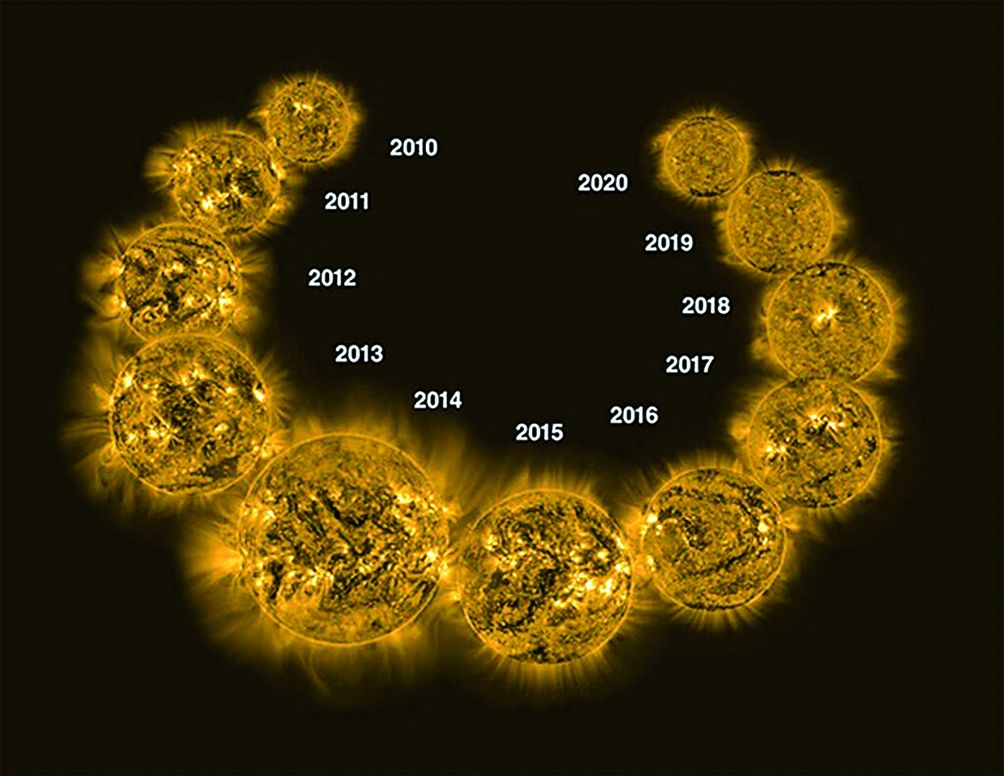 Lo que debemos saber también es que la actividad solar tiene ciclos. Estos ciclos se pueden visualizar a través del conteo de lo que se denominan Manchas Solares, o sea el Sol no es una constante como algunos quieren hacernos creer. El Sol no sólo es un plasma que gira sobre su propio eje con velocidad de rotación diferente entre su ecuador (tarda 25 días en dar una vuelta) y sus polos (tarda 36 días en dar una vuelta), sino que también es un gran magneto que cambia de polaridad (signo positivo o negativo de sus polos) aproximadamente cada 11 años. Esta diferencia de rotación es la responsable de deformar los campos magnéticos solares generando la aparición de manchas solares y estas aumentando la radiación solar incidente sobre la tierra, incluso a veces provocando grandes desprendimientos de masa coronal solar que impactan en la atmósfera terrestre generando numerosos interferencias de radio y apagones masivos por perturbaciones magnéticas y eléctricas en las redes de transporte y distribución de energía eléctrica.