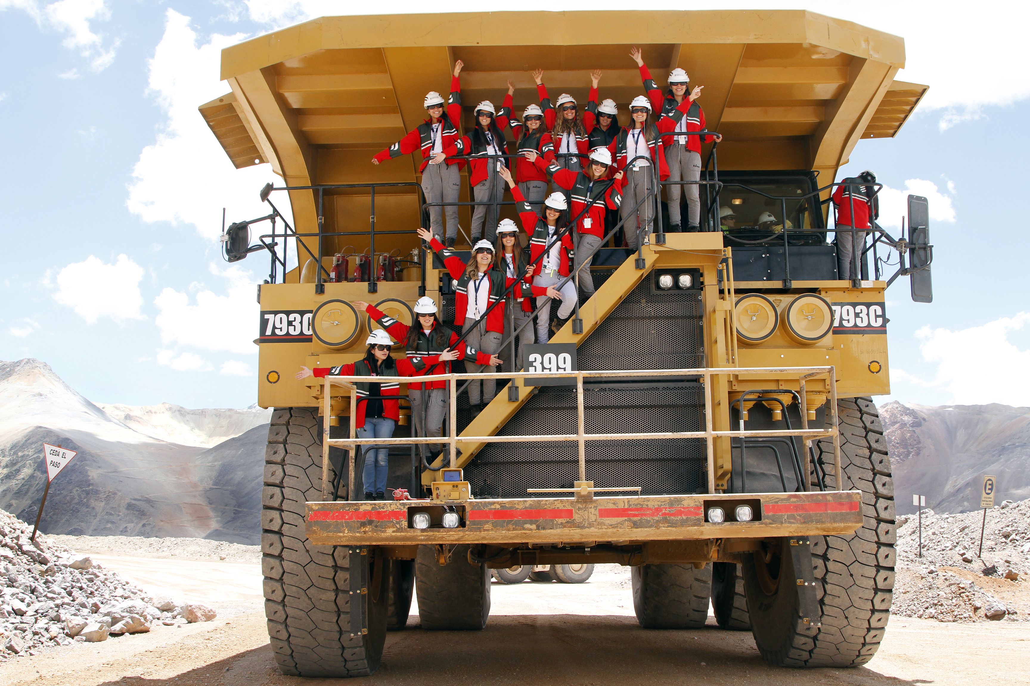 Bien alto. Las candidatas subieron inmediatamente al camión fuera de ruta para sacarse fotos y conversar con la conductora, una experimentada operaria que lleva 12 años trabajando en Veladero.