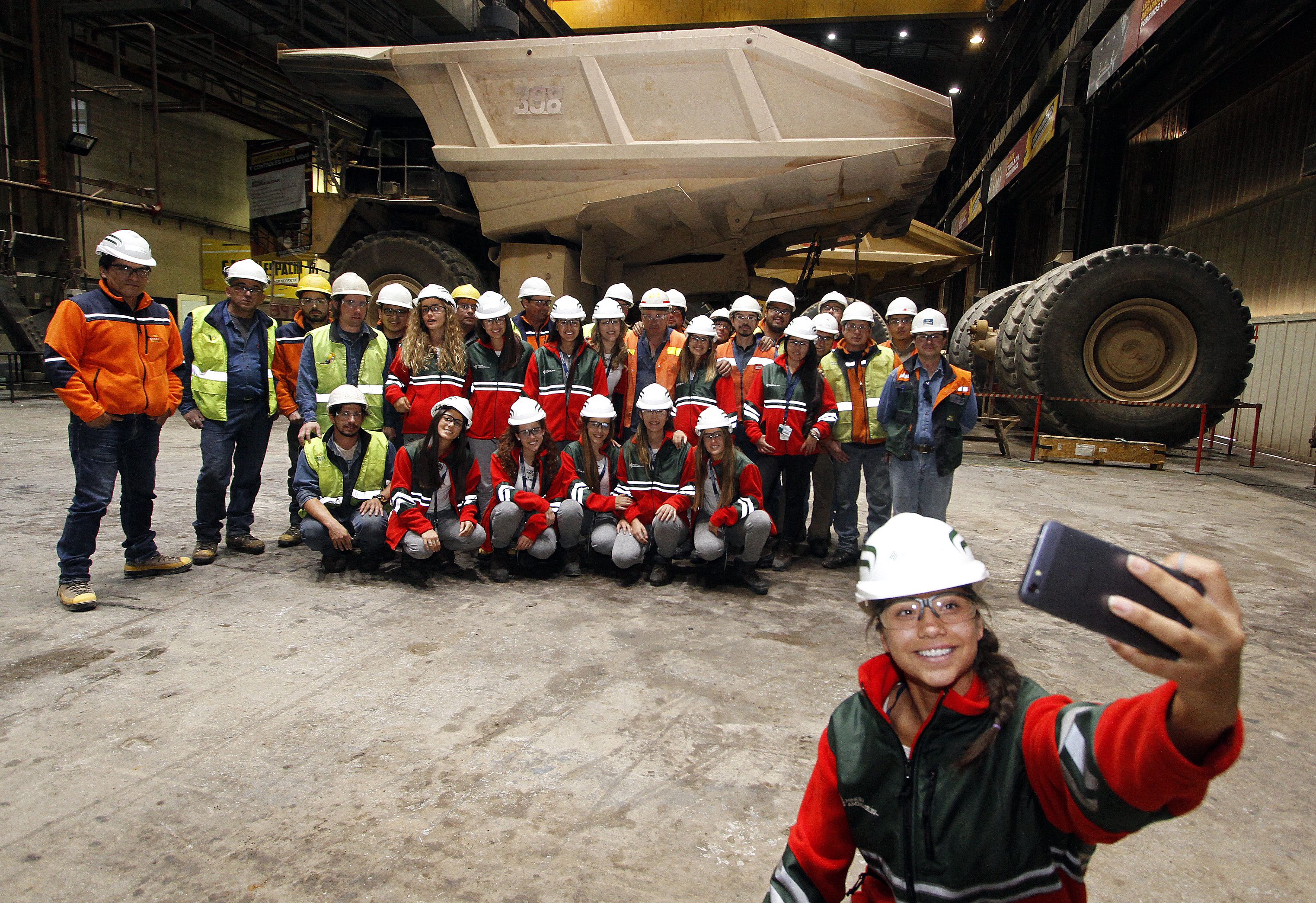 Selfie-time. Las jóvenes aprovecharon las grandes máquinas de la mina para tomar fotos y selfies durante todo el recorrido.