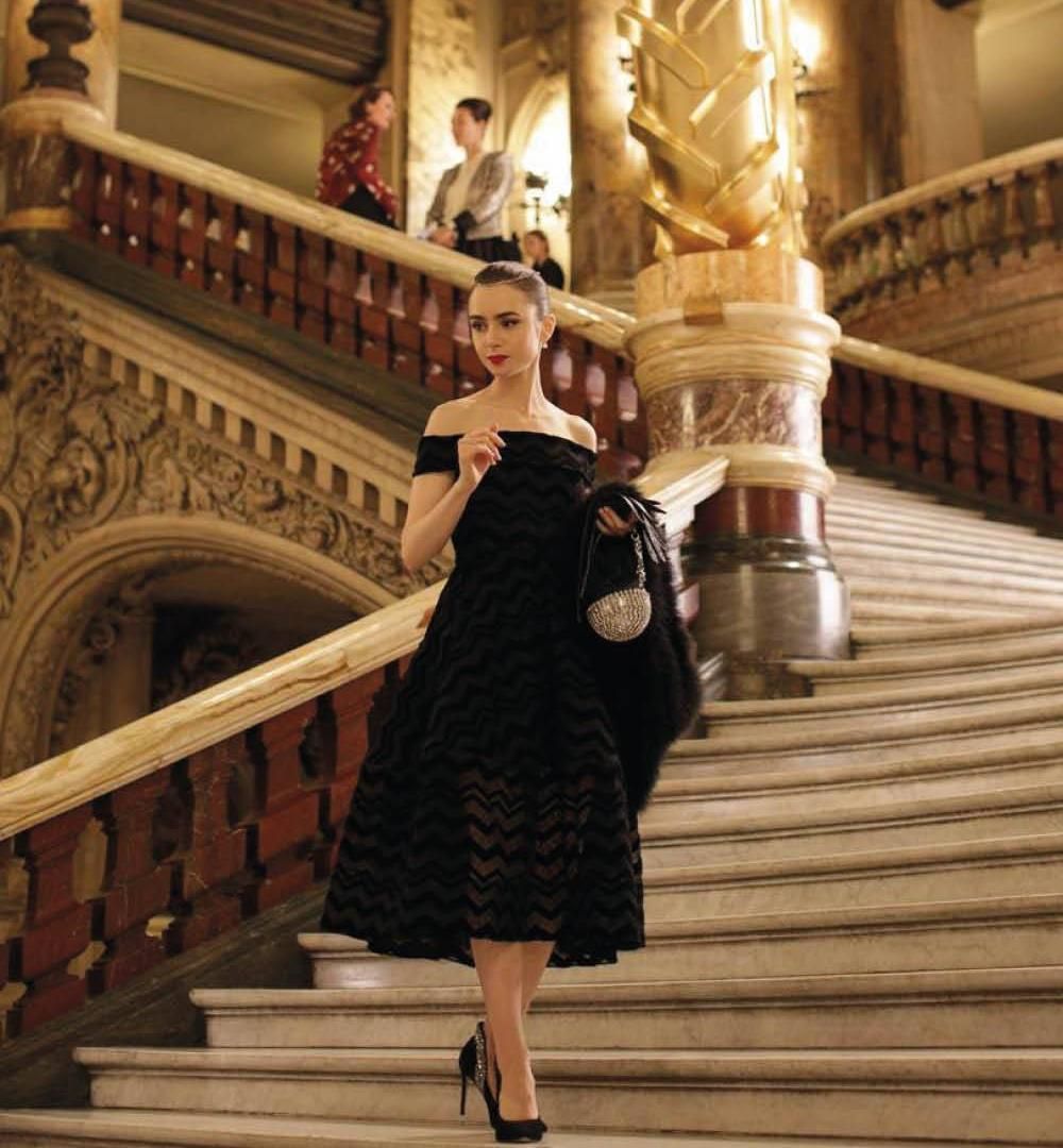 Para una noche en la ópera, Collins luce un exquisito vestido combinado con guantes largos, que es una alusión a Audrey Hepburn en Funny Face. Lily Collins anuncia su compromiso con Charlie McDowell. ¡Un vestido mágico en una noche mágica! Con escote strapless de terciopelo y amplia falda de capas de tul, un homenaje a la falda de tul que llevó Carrie en el final de Sex and the City, que también tiene lugar en París.