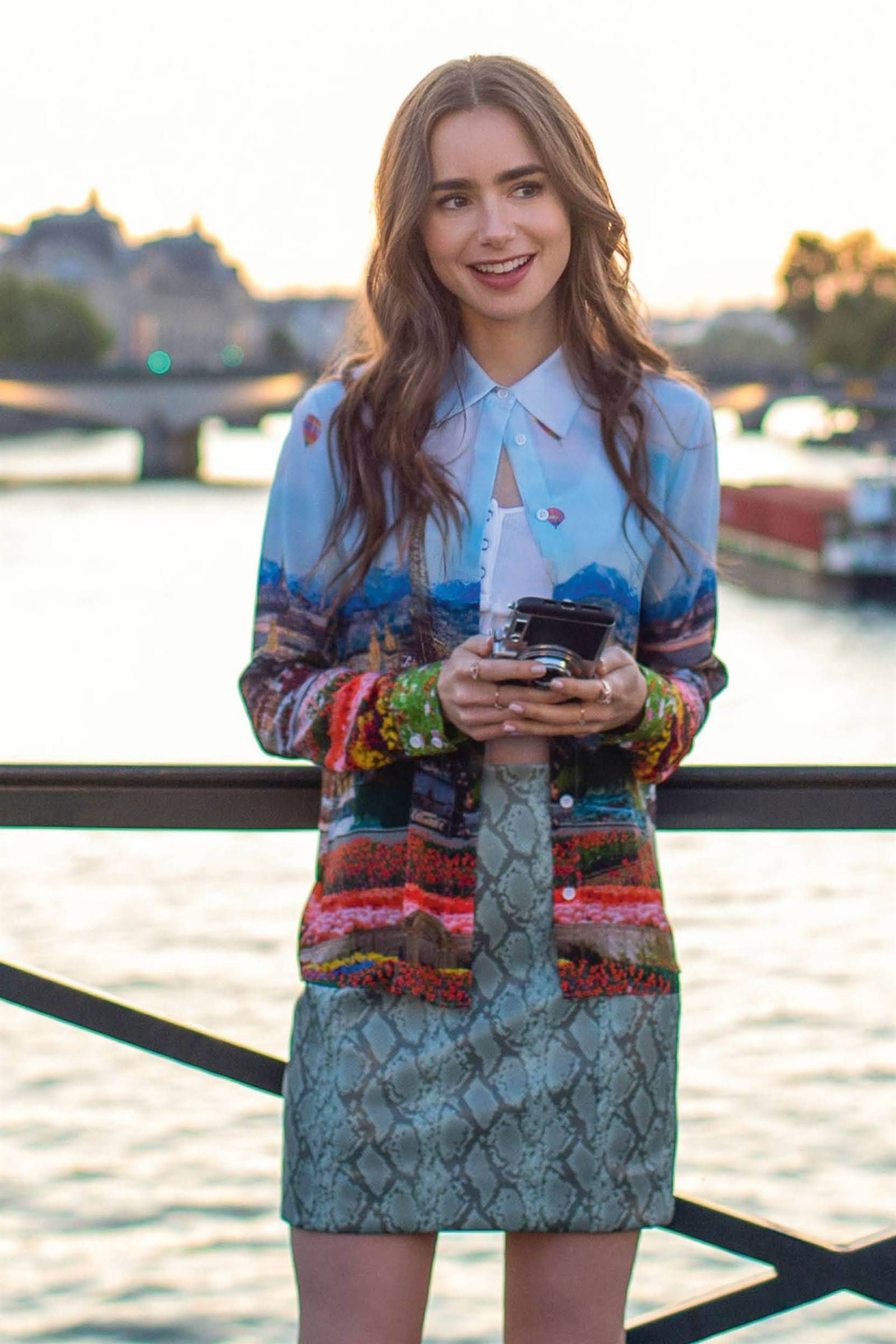 Cuando se presenta en su primer día de trabajo en París, Emily lleva una blusa cuyo diseño muestra una pintura del paisaje que rodea la Torre Eiffel. Como si esto fuera poco, la acompaña con una falda efecto piel de serpiente y unos tacones altos de Christian Louboutin que dicen París a los lados. Se marca así la oposición con su jefa Sylvie (Philippine Leroy Beaulieu), cuyos looks completamente negros (parisinos por excelencia) parecen sacados de las pasarelas de Rick Owens y Yohji Yamamoto.