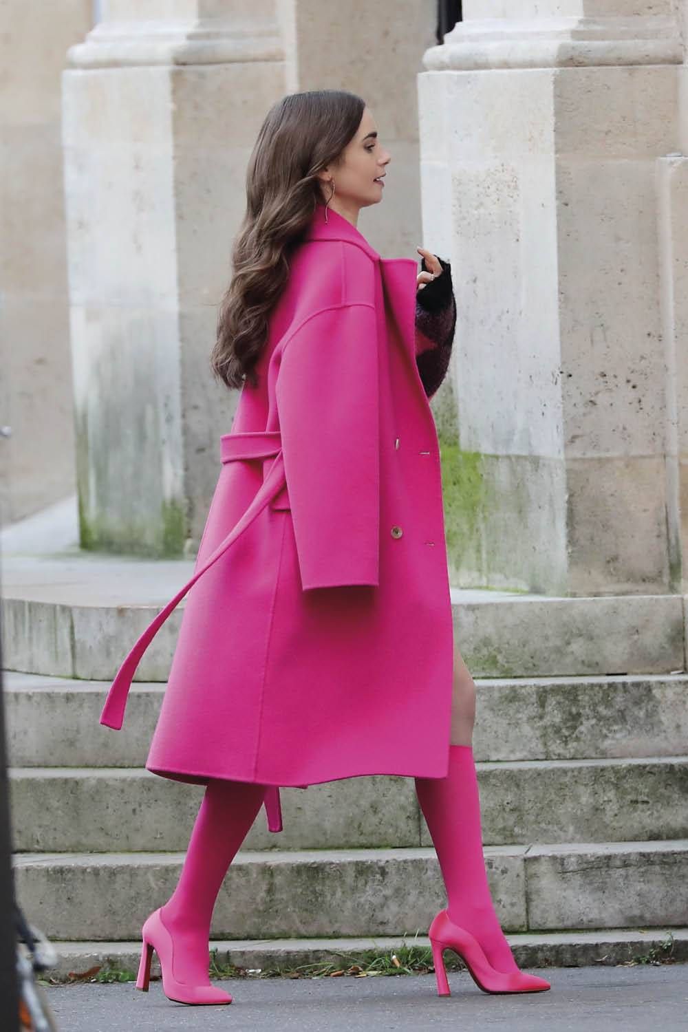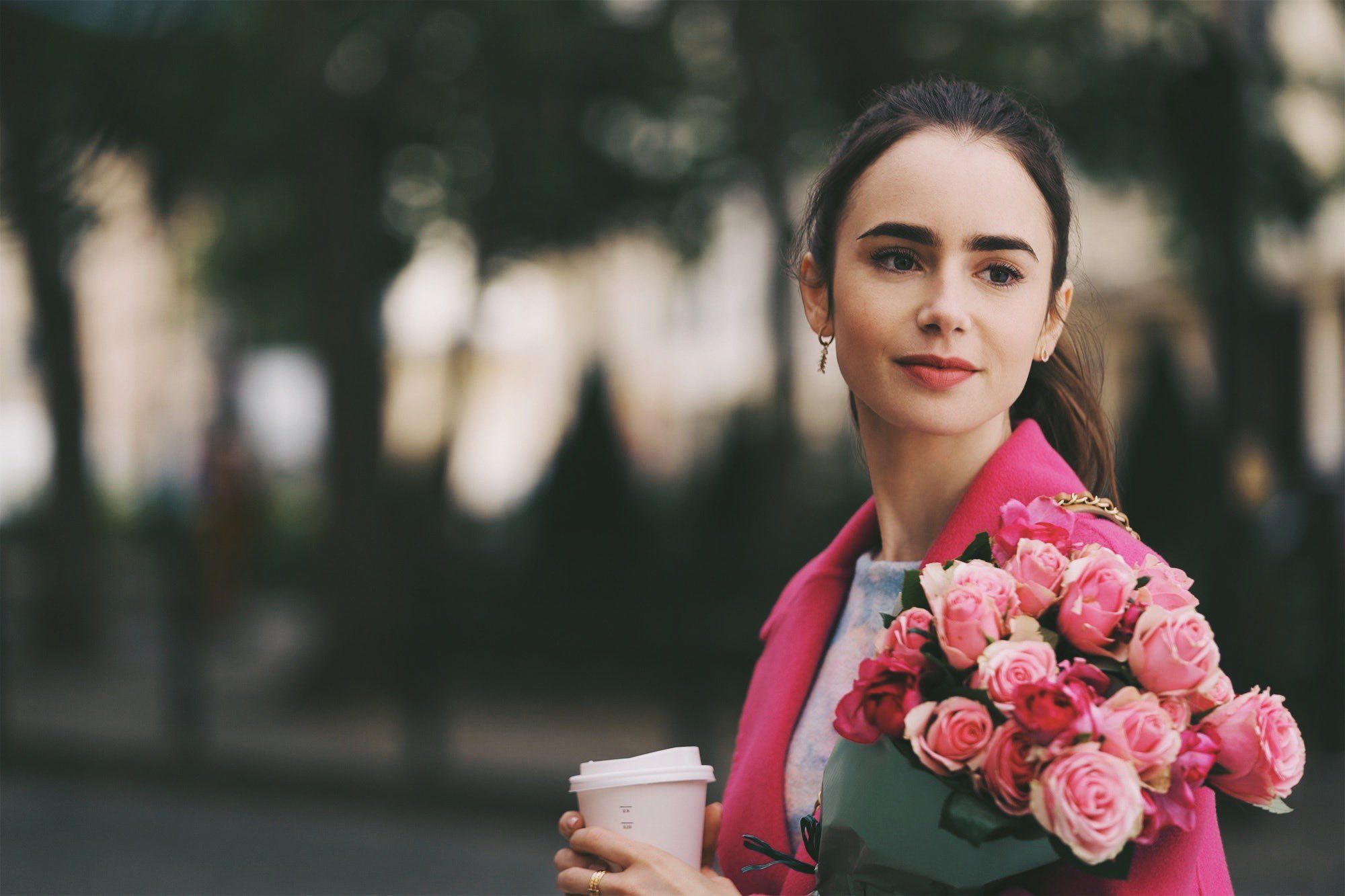 Emily Cooper combina su romántico estilismo, de abrigo maxi y jersey de tonos pasteles, con las rosas que ha comprado para su jefa, creando una estampa casi poética que nos hace soñar con tener un conjunto así este invierno. Ese abrigo largo de cachemir y lana en color rosa intenso con solapas entalladas y cinturón removible es de la firma Kenzo, ideal para replicar.