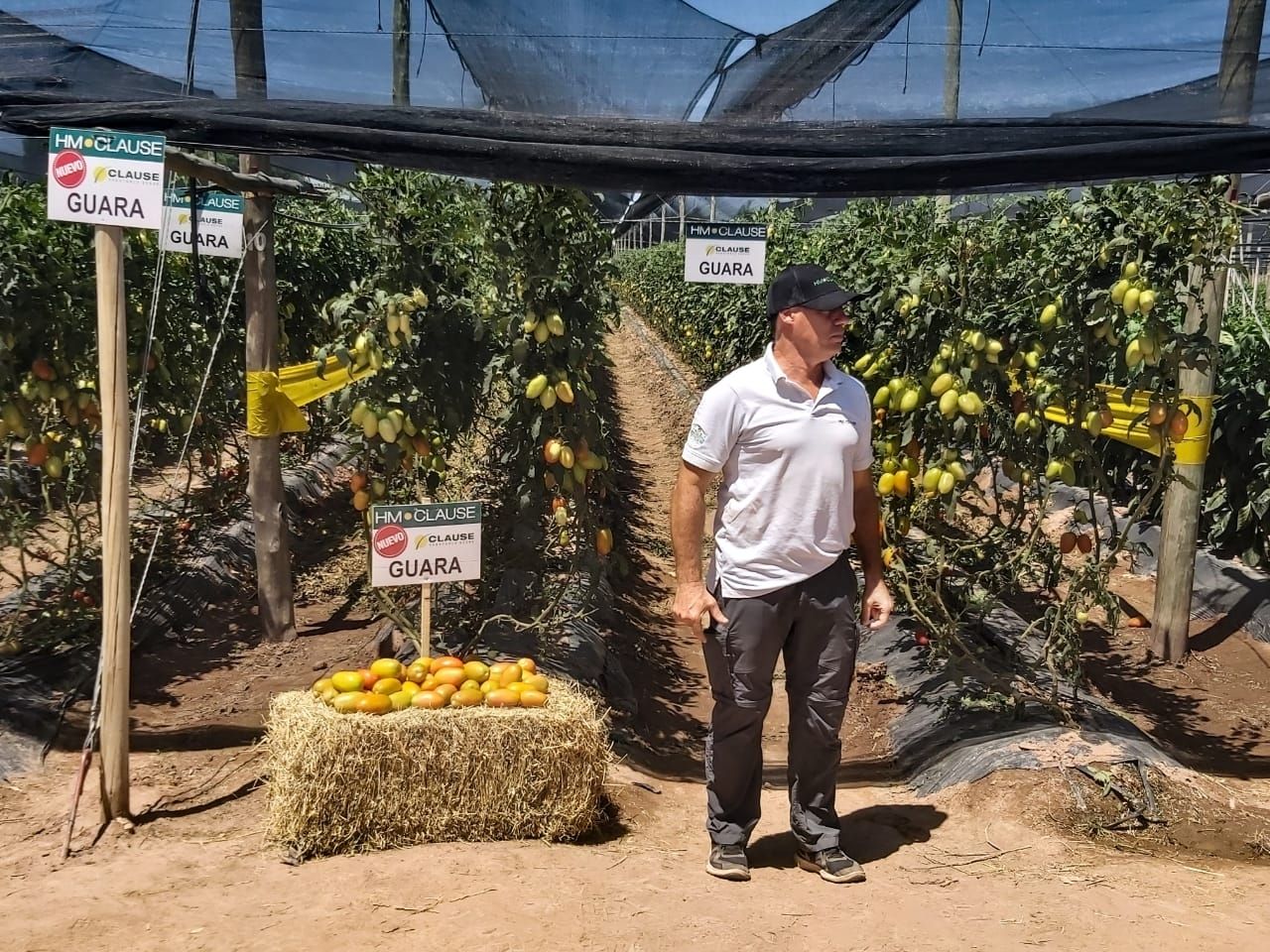 "Y también hicimos parcelas para que visite el público de un tomate tipo pera indeterminado, llamado Guara, de gran calibre y alta producción. Estuvo Federico de la Portilla, ingeniero de nuestra empresa, de la zona este de Buenos Aires".