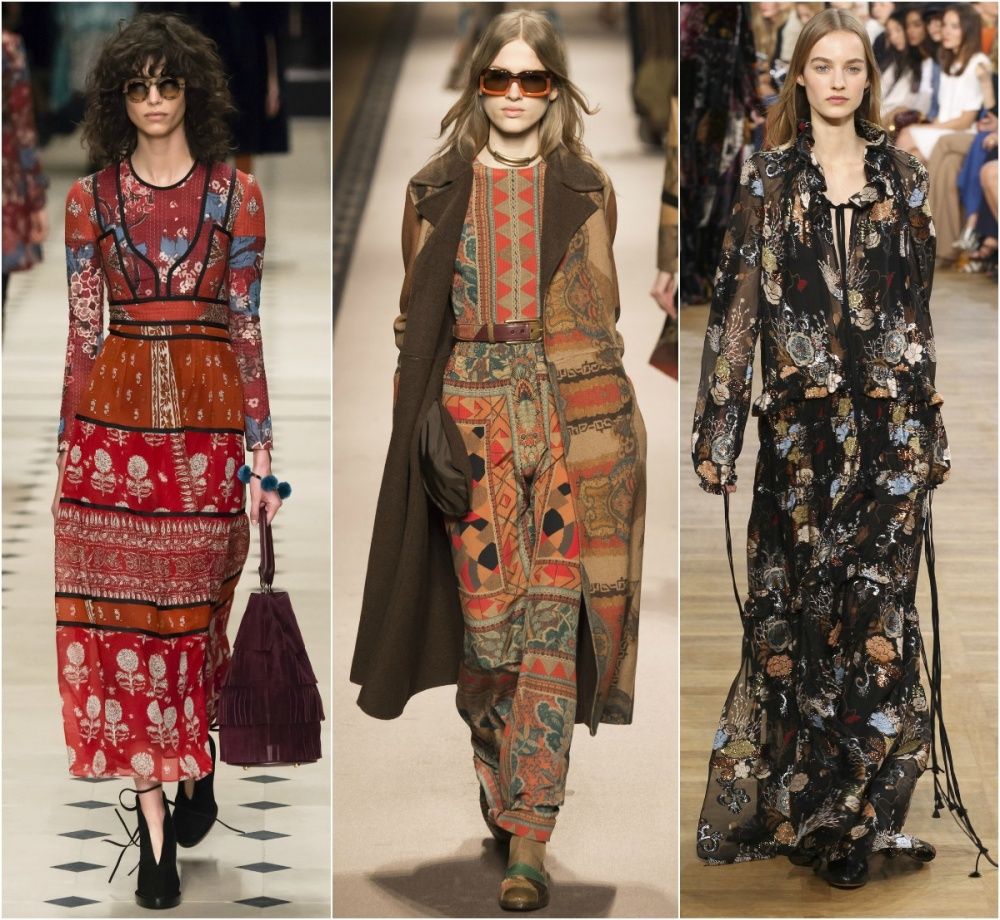 El hippie-folk se ve en maxivestidos, blusas y palazzos estampados florales o patchwork.