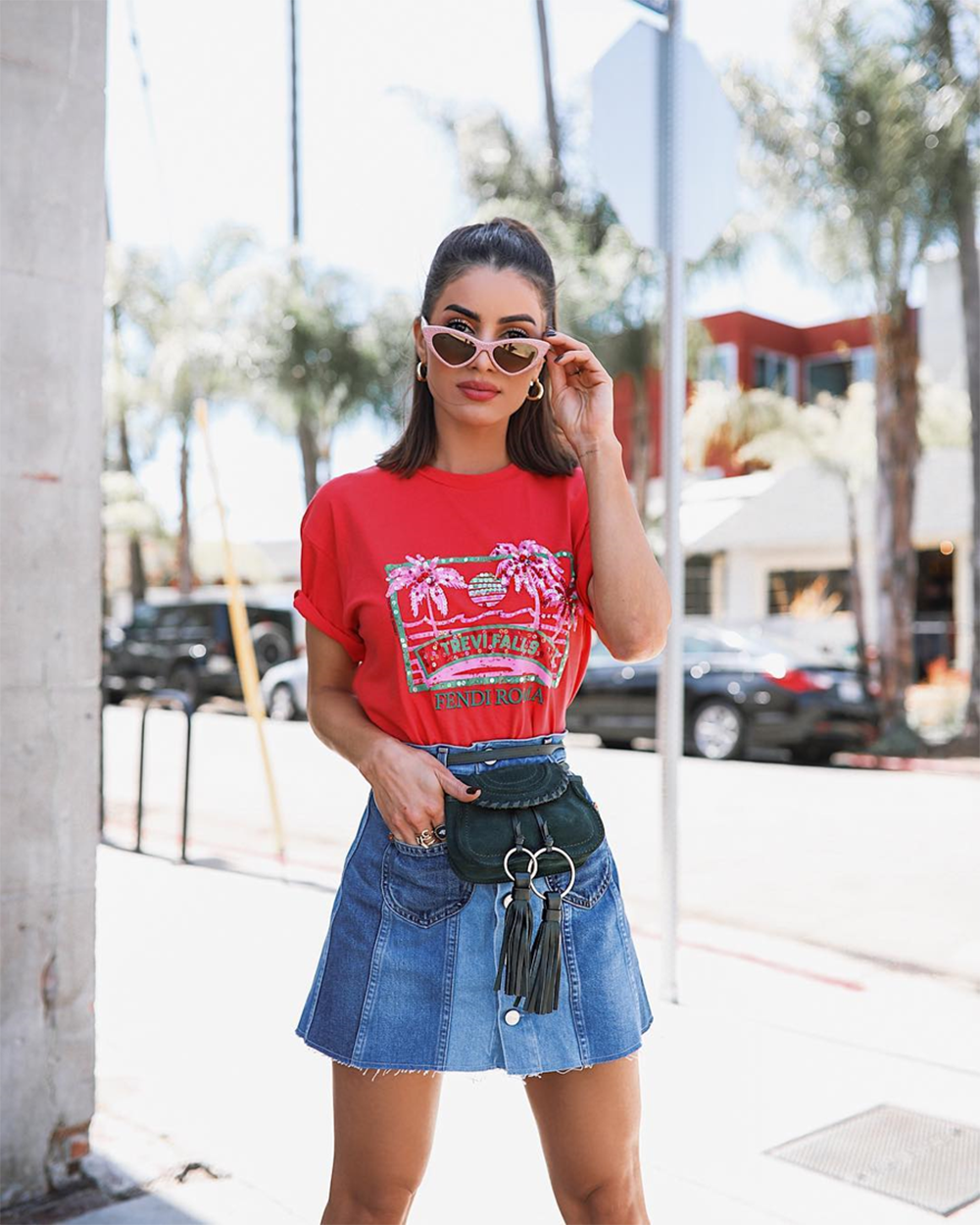 Gafas felinas de pasta rosa y riñonera vintage, ¿quién dijo miedo? Integra ambos accesorios en un look de lo más básico y acierta de lleno.