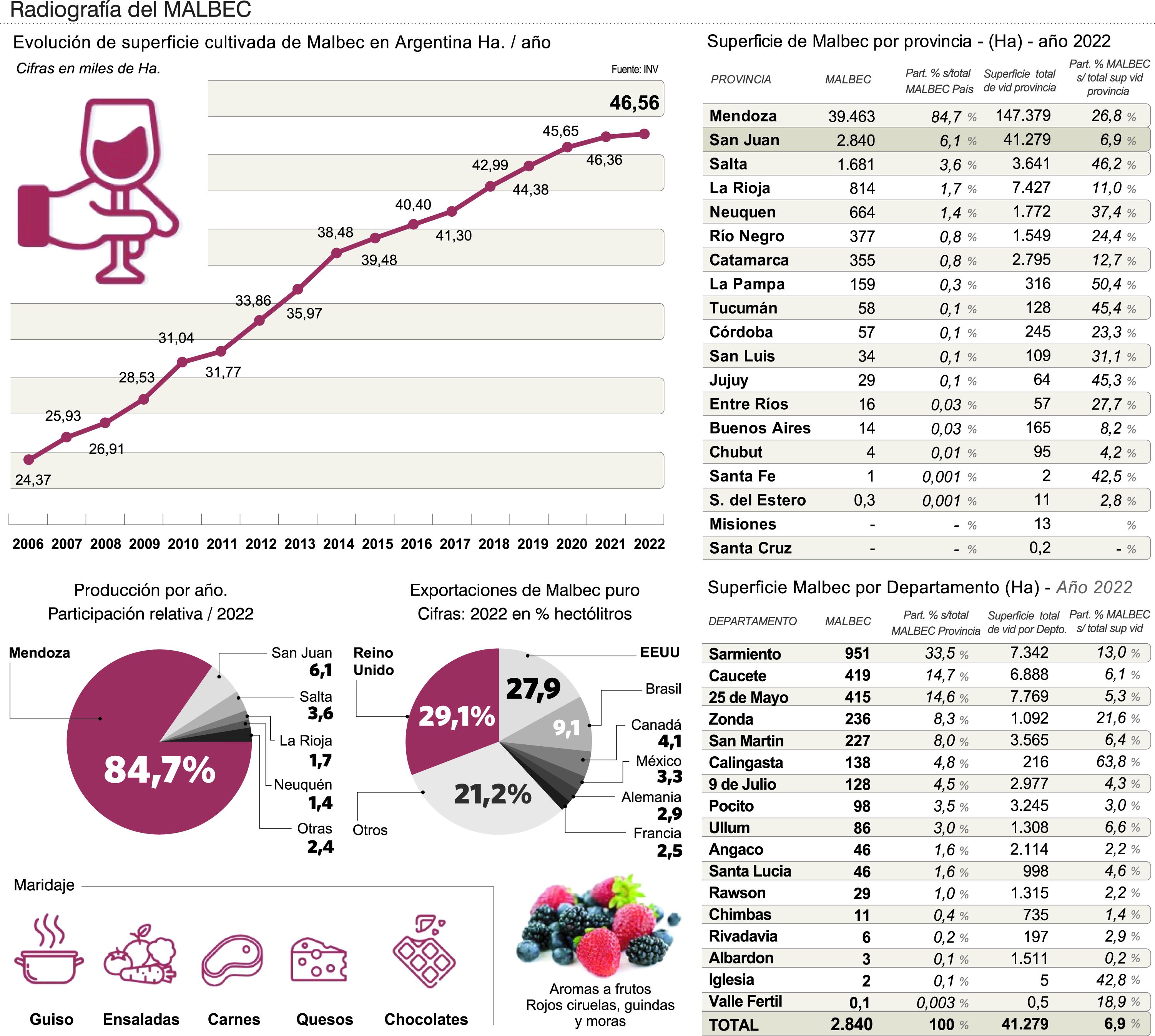 Durante el año 2022 las exportaciones de vinos varietales elaborados con la variedad Malbec alcanzaron un total de 1.509.857 hectolitros, por un valor FOB de 509,2 millones de dólares, lo que determina un precio medio por litro de vino de 3,37 dólares. Exportaciones de este varietal han crecido en volumen un 59% y en valor un 47% respecto al año 2010. El 96% del total exportado de varietales de Malbec corresponde a varietal puro y 4% a cortes con otras variedades. El corte varietal que más se exporta es Malbec-Syrah (29%), seguido por Malbec-Cabernet Sauvignon (19%) y Malbec-Bonarda (12%). No obstante, el corte que representa el mayor valor FOB es Malbec-Cabernet Sauvignon (32%), seguido por Malbec-Cabernet Franc (13%). El Malbec puro se exportó en 2022 a 120 países, siendo los principales destinos Reino Unido (29,1%) y Estados Unidos (27,9%). Luego figuran Brasil, Canadá y México.