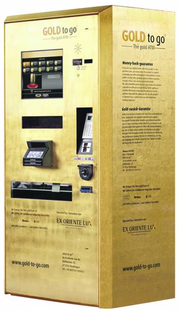 Si se viaja por Alemania o Emiratos Árabes Unidos (EAU), y de improviso uno desea “refugiarse en un mineral seguro” puede adquirir en aeropuertos barras y monedas que van de 1 a 32 gramos de oro puro, la empresa de cajeros automáticos ATM ha instalado máquinas expendedoras del metal dorado que aceptan efectivo y pago con tarjeta de crédito. La compañía ha decidido que estos “cajeros de oro” se instalen en aeropuertos, estaciones de tren y centros comerciales. El precio de los productos variará de acuerdo a la cotización del oro en el mercado según informaron fuentes de la empresa.