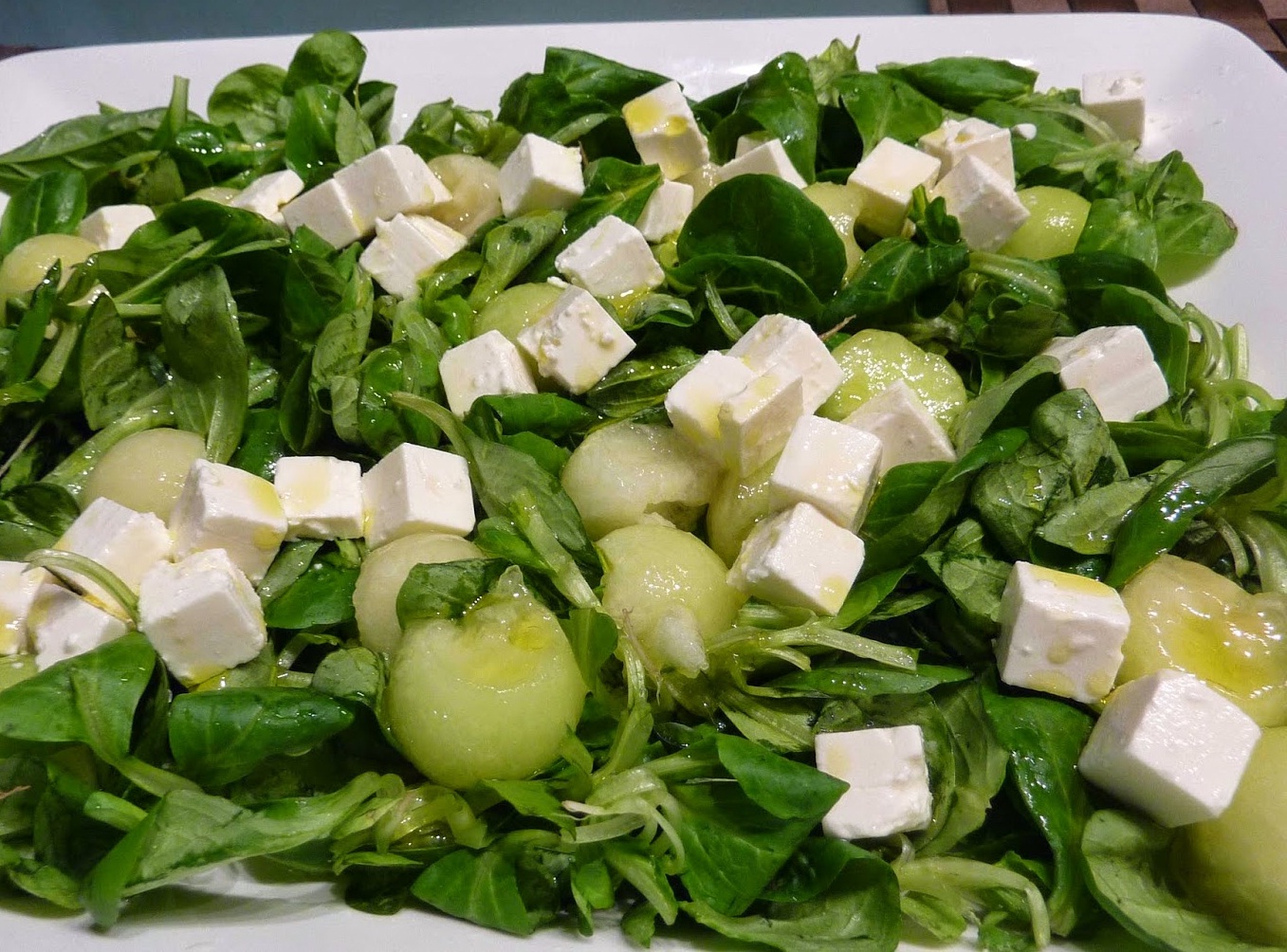 Ensalada de melón con Brie, almendas, espinacas y limoneta