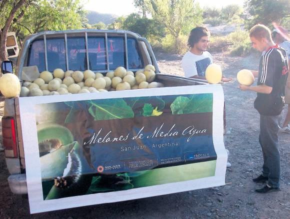 Los productores de Sarmiento dijeron presente en el Rally Internacional Dakar 2012 colocando una camioneta con melones de Media Agua en el Camping de Pedernal, departamento Sarmiento. "Los resultados fueron fabulosos" señaló Alfredo Reyes, joven productor de melones de Tres Esquinas quien fue el responsable junto a otros jóvenes chacareros de esta iniciativa que contó con el apoyo del Procal. En el departamento Sarmiento esta cucurbitácea alcanza su máxima expresión en las variedades del tipo Rocío del Miel y por ello los productores, junto al municipio, el INTA, Escuela Agrotécnica Sarmiento, el Prosap San Juan y el Programa de Gestión y Diferenciación de la Calidad de los Alimentos del Ministerio de Agricultura de la Nación y la Secretaría de Agricultura de nuestra provincia desarrollan ya un proceso de Indicación Geográfica de Origen, "Melón de Media Agua, San Juan".