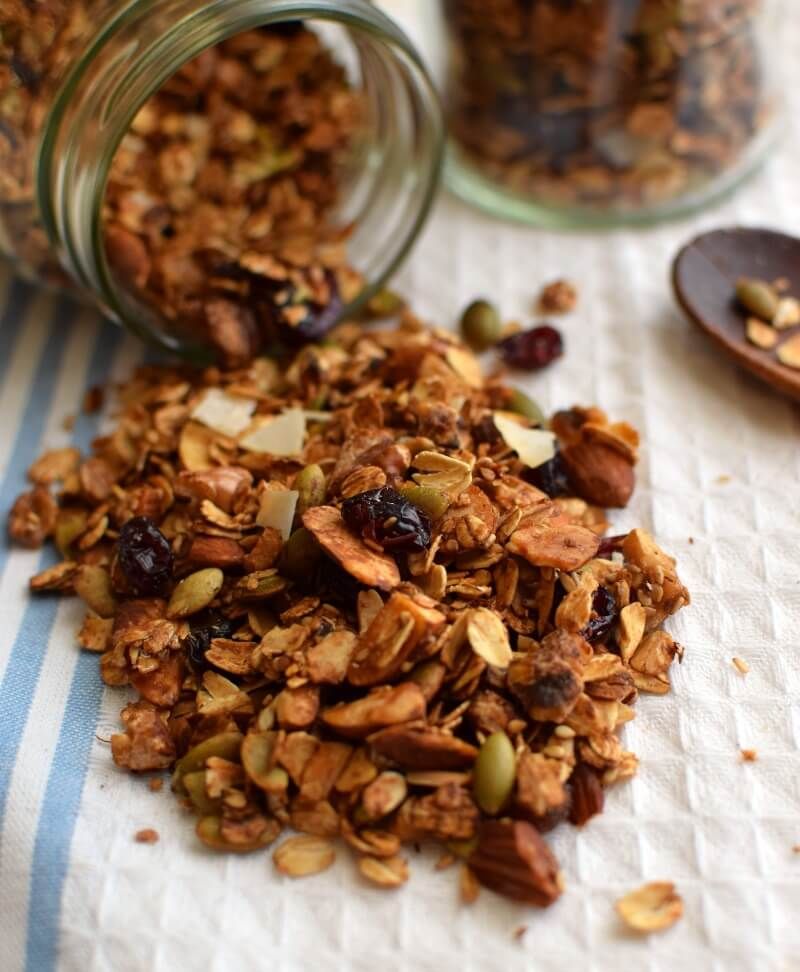 Preparación: Colocar en una fuente para horno la avena y la miel. Incorporar bien y llevar al horno por 5 minutos. Sacar la fuente del horno y volver a mezclar la preparación. Repetir 3 veces este paso. Agregar los frutos secos cortados (no muy pequeños), el coco y las pasas y nuevamente al horno durante 5 minutos. Dejar enfriar y guardar en un recipiente hermético para que al comer, resulte crocante.