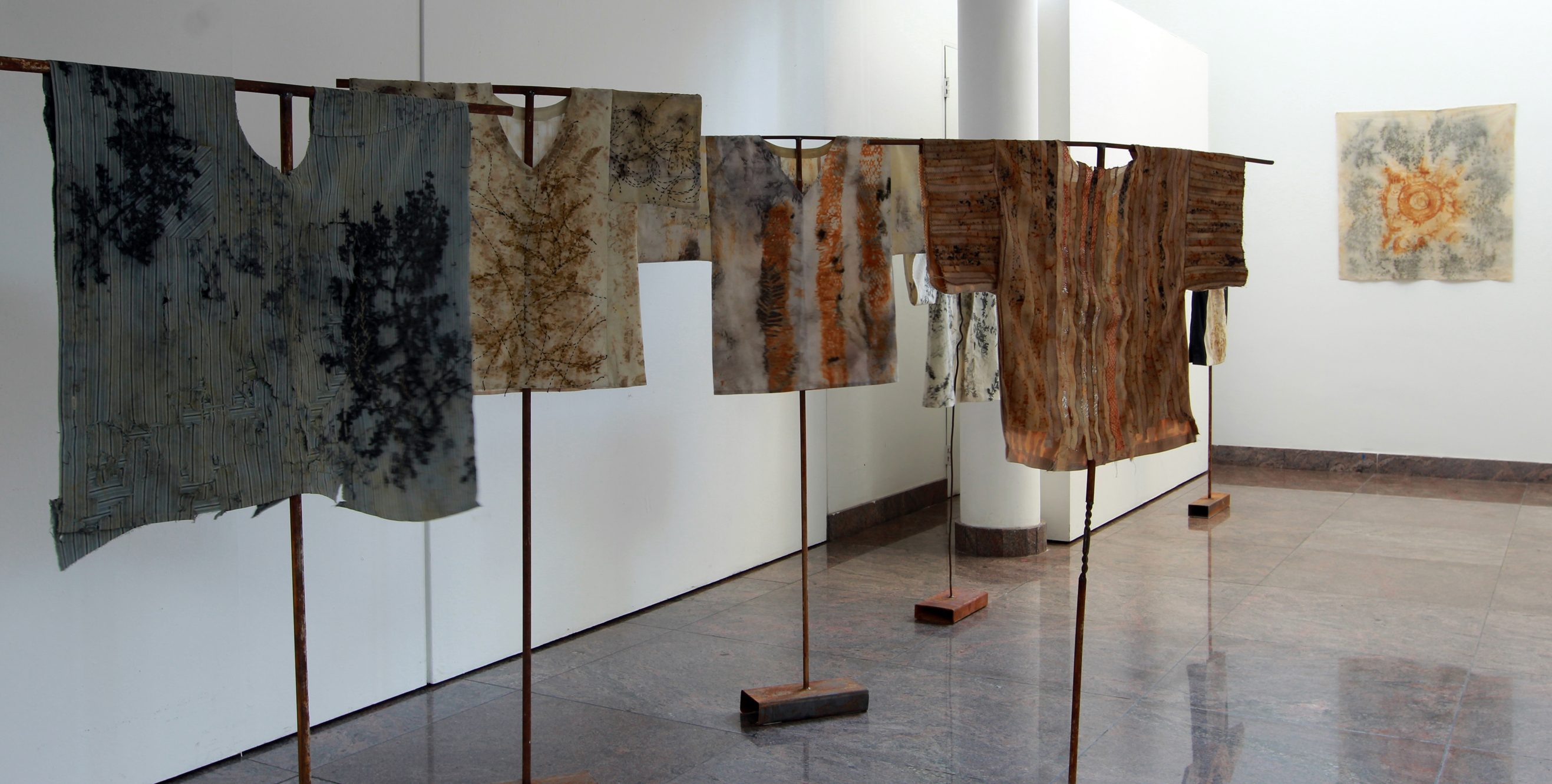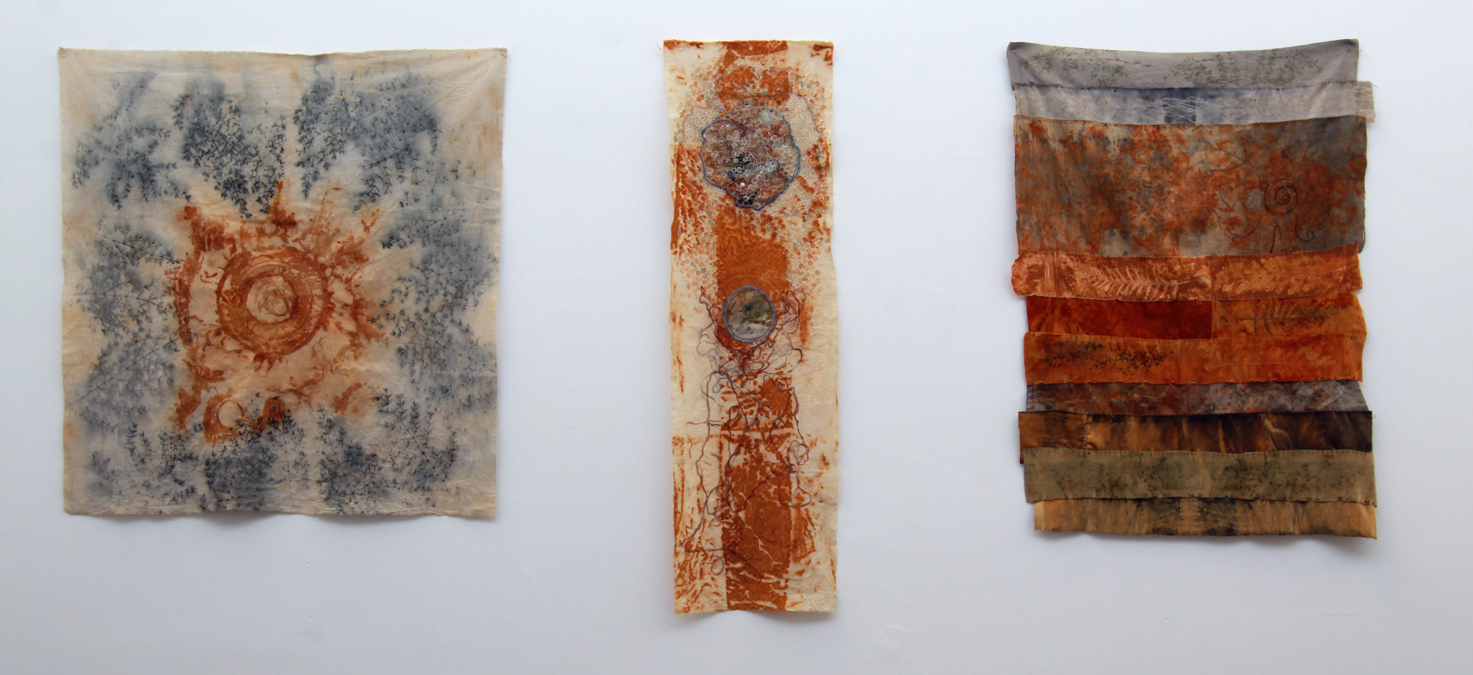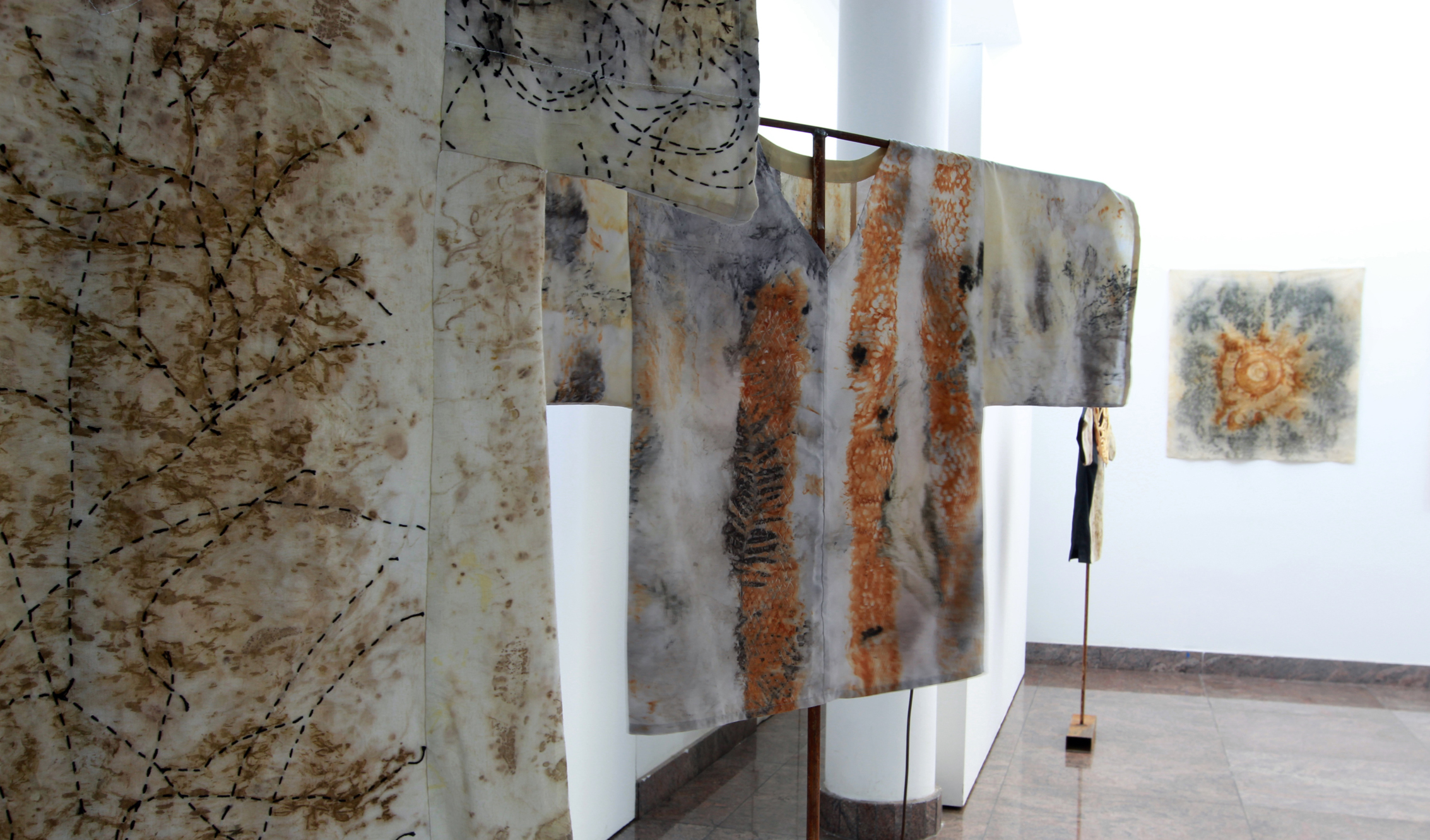Gabriela Riveros es otra de las artistas involucradas en esta exposición de vanguardia más dedicada a los bordados (con hilo de coser) que se asemejan a cosas arcaicas y también impulsora de la investigación y experimentación del ecoprint. Así fueron sumando creaciones ahora todas expuestas al público.