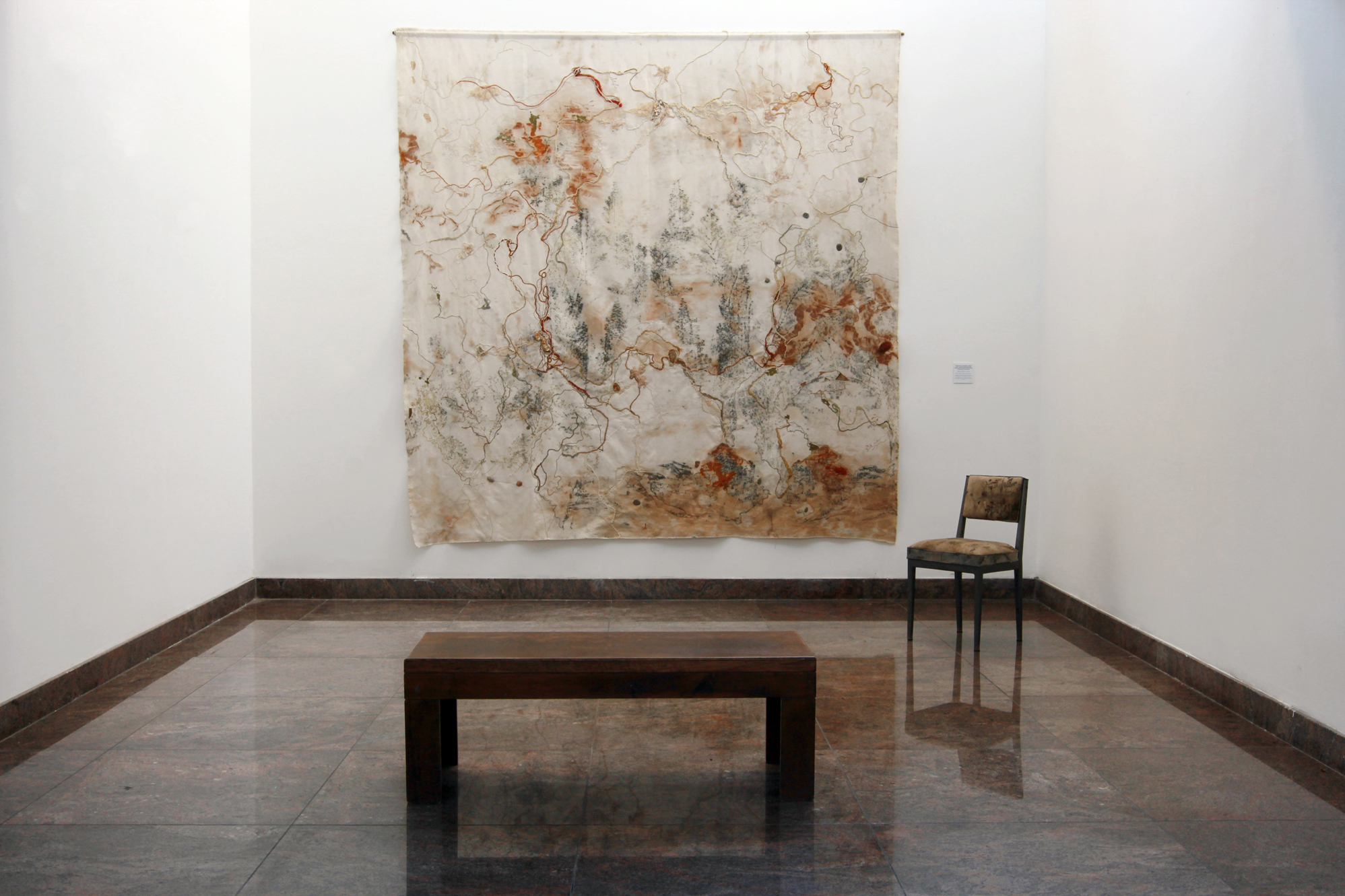 Otro de los grandes impactos visuales de la exposición es un "telón" -llamado así por las dimensiones de la tela-, colocado sobre una de las paredes del subsuelo. Demanda varios minutos apreciar los detalles mínimos de bordados, lanas, aplicaciones de piedras, entre otros materiales. La particularidad es que a primera vista parece una toma aérea de una porción de suelo sanjuanino. Rápidamente uno imagina su río, los colores de las montañas, la flora del lugar, entre otras tantas sorpresas que siempre brinda el desierto a quien se anima a mirar. Una obra colectiva en la que participó todo el equipo de artistas investigadores.