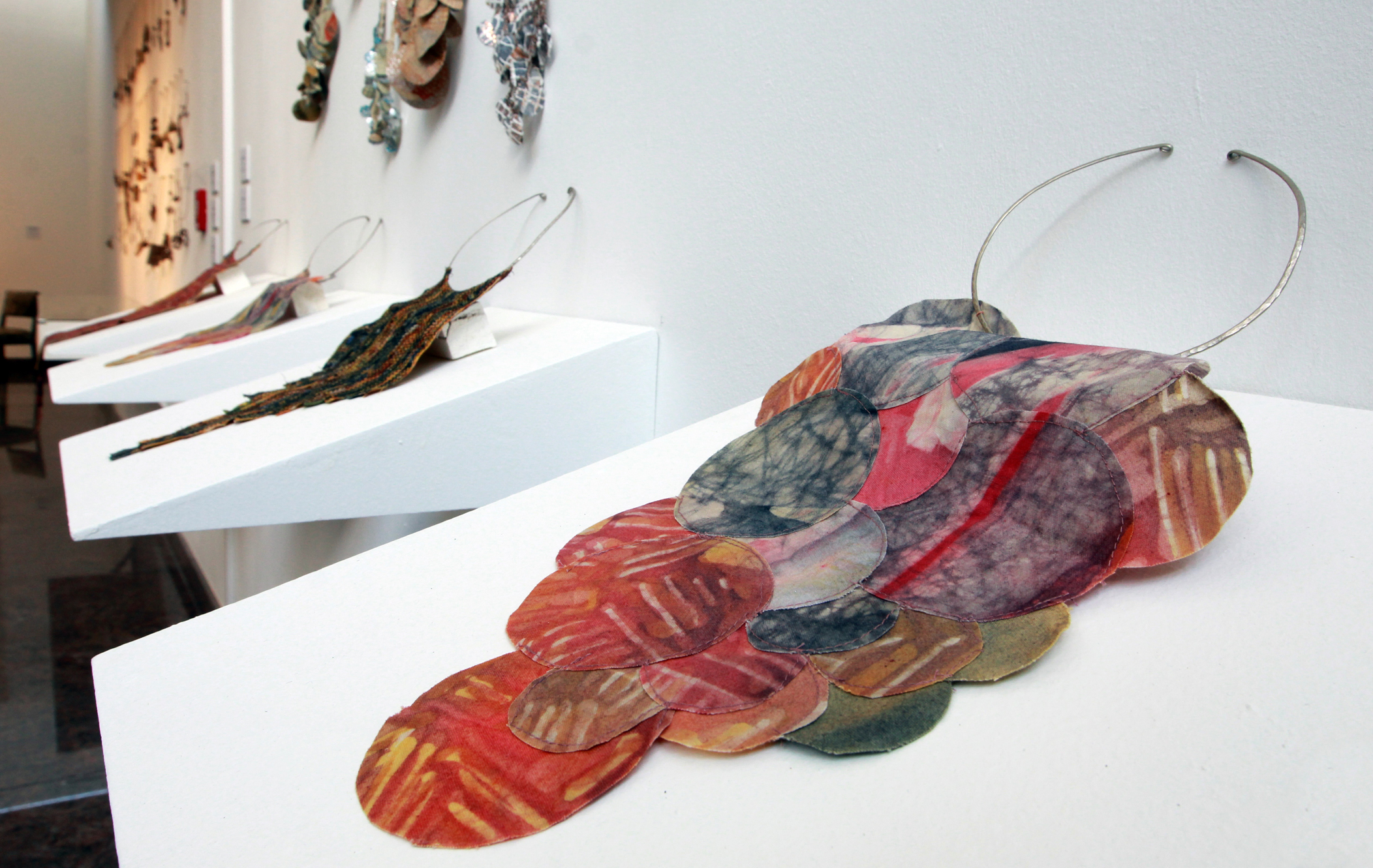 En el mismo sector Ivana Goya trabajó costuras, indumentaria, tejidos e indagó en joyería cuyas piezas están exhibidas junto a las de Graciela Pérez