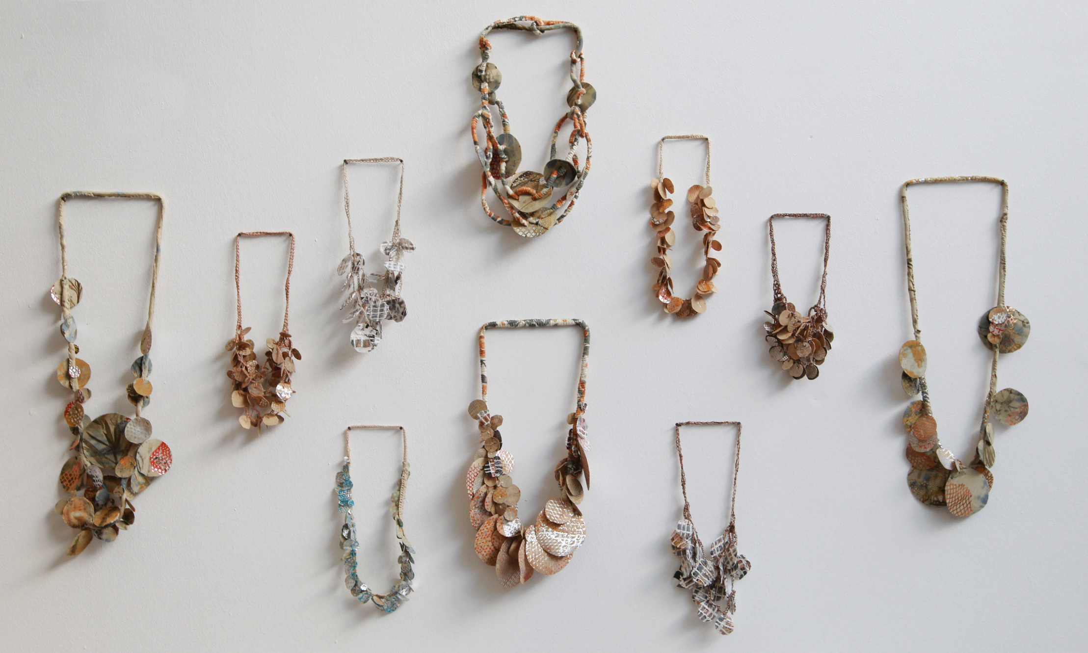 "Un laboratorio es un espacio de pura experimentación así es que no había nada de nuestro territorio que no fuera útil, todo dependía de lo que cada uno buscaba", indica Federico Levato quien, en este caso, estuvo dedicado a la joyería y objetos portables que incluyen desde obras repletas de fragmentos. Usó desde metales, hasta pedazos de madera, zarcillos de sarmiento de los parrales a los que la naturaleza ya se encargó de darle forma, hasta desechos que sobraban de otras obras.