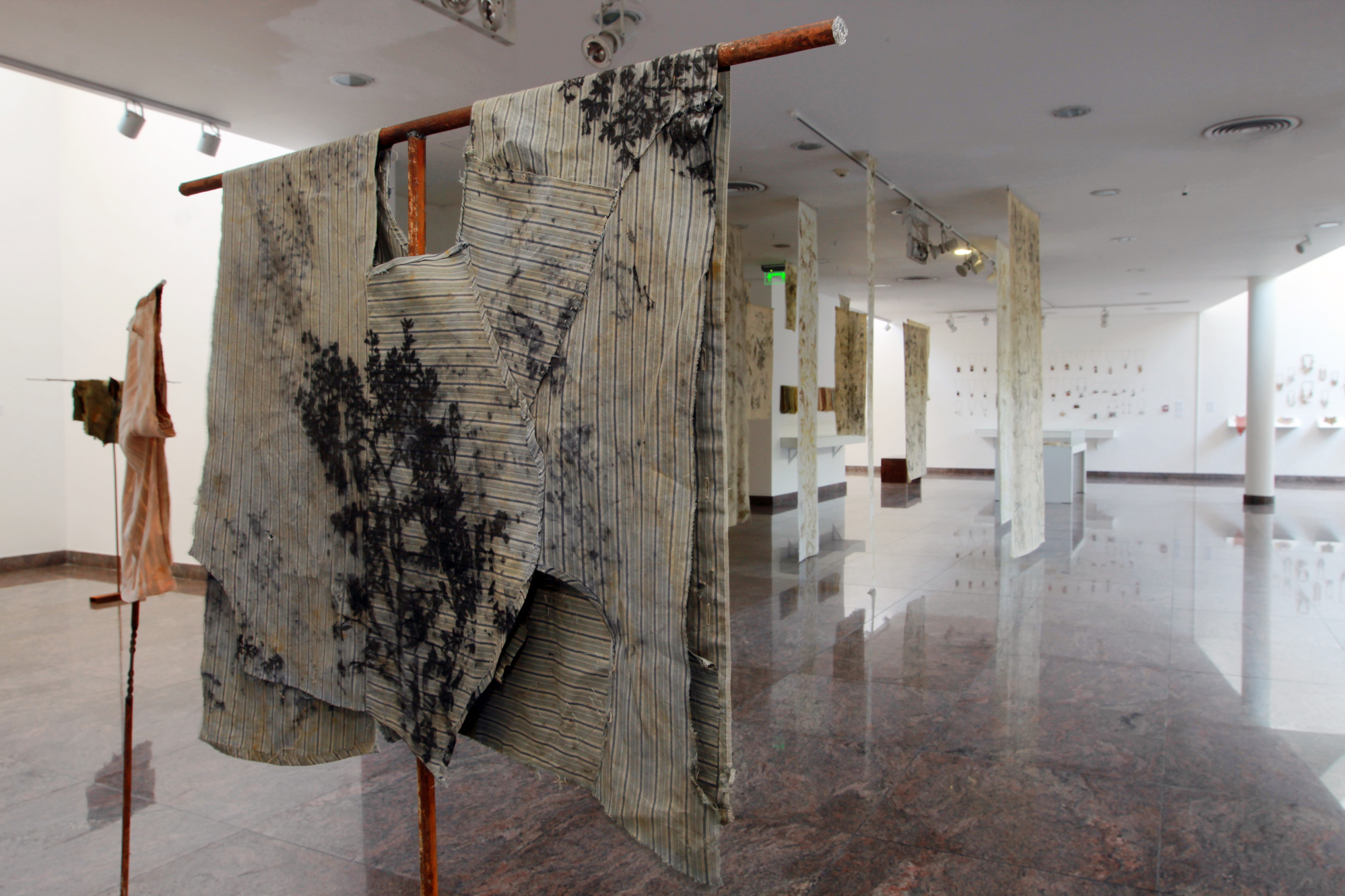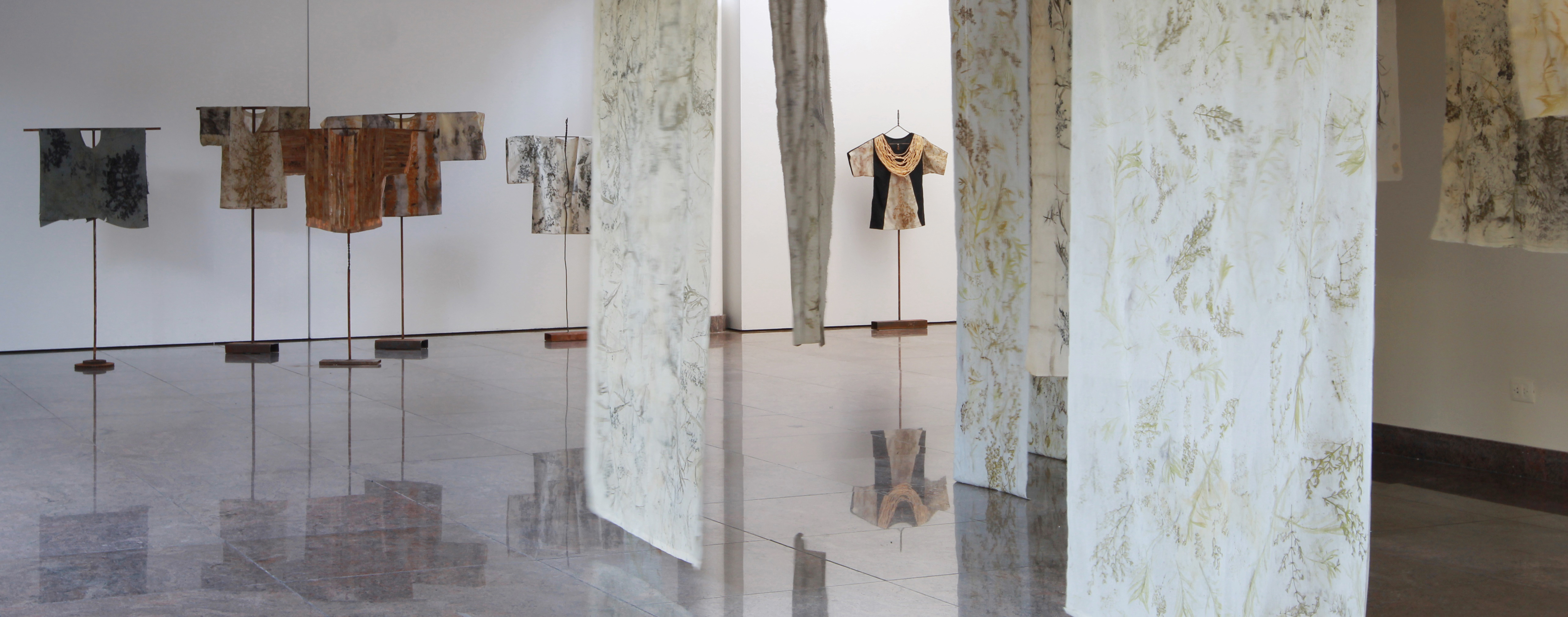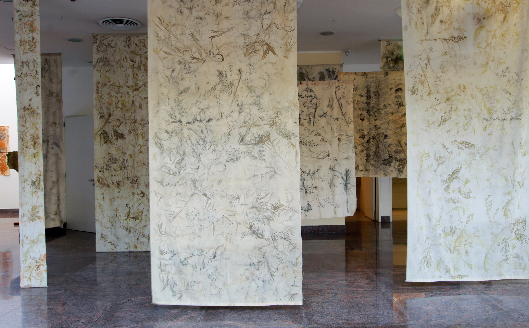 Es una obra que impacta apenas el visitante baja las escaleras que llevan al foyer. Justo a la izquierda se encuentra una colección de telas colgantes que a primera vista parece un bosque pintado de jarilla y chilca pero que en realidad son diferentes especies de esta planta impresas con la técnica ecoprint. Esta permite que sean los mismos pigmentos naturales de hojas y flores los que queden plasmados tras un minucioso proceso que se asemeja a una alquimia de la propia naturaleza y la mano de los artistas. (ver recuadro Casi una pintura). Un verdadero relato de plantas básicas de este suelo reseco.