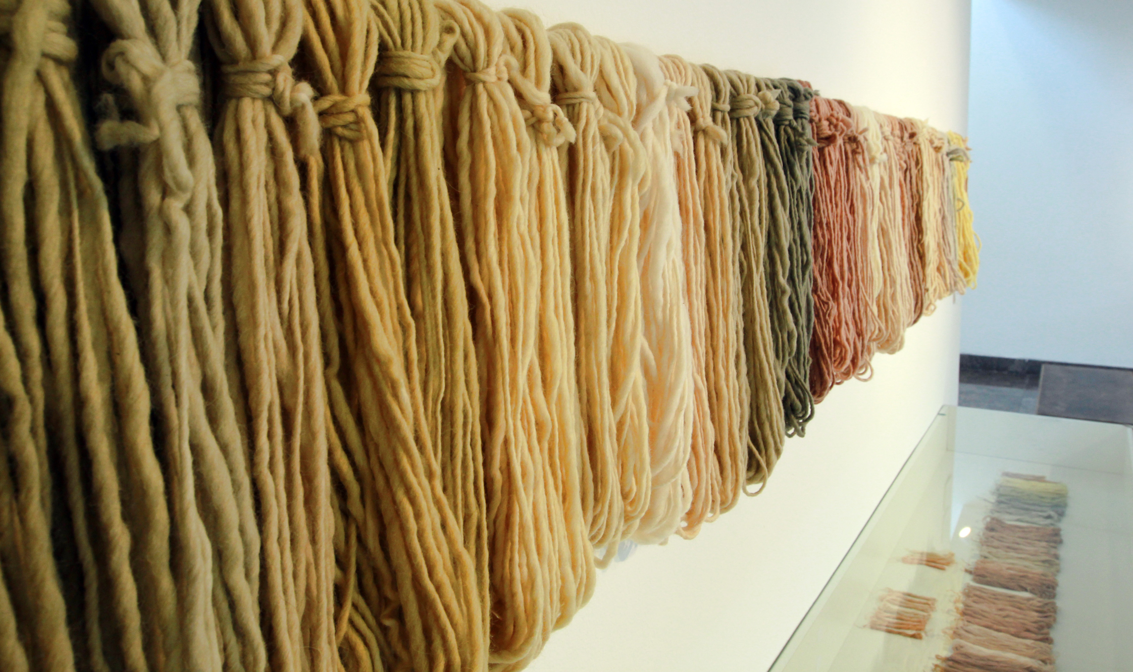 El recorrido continúa hasta que aparecen hilos teñidos de diferentes tonos terrosos, producto de tintes naturales que fueron usados en diferentes piezas. Un deleite para la vista.