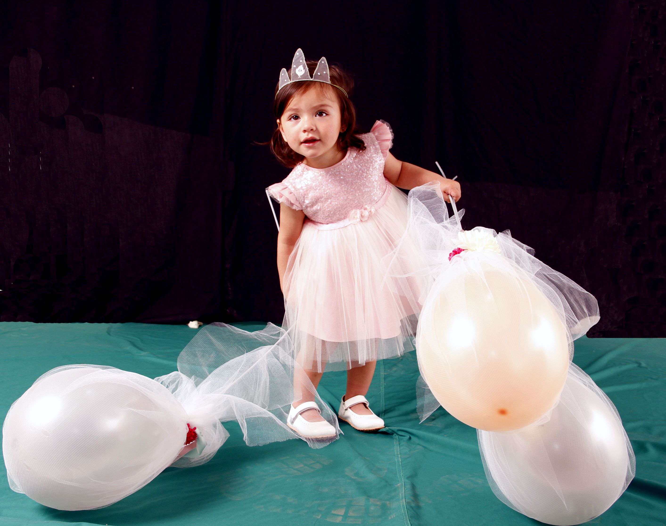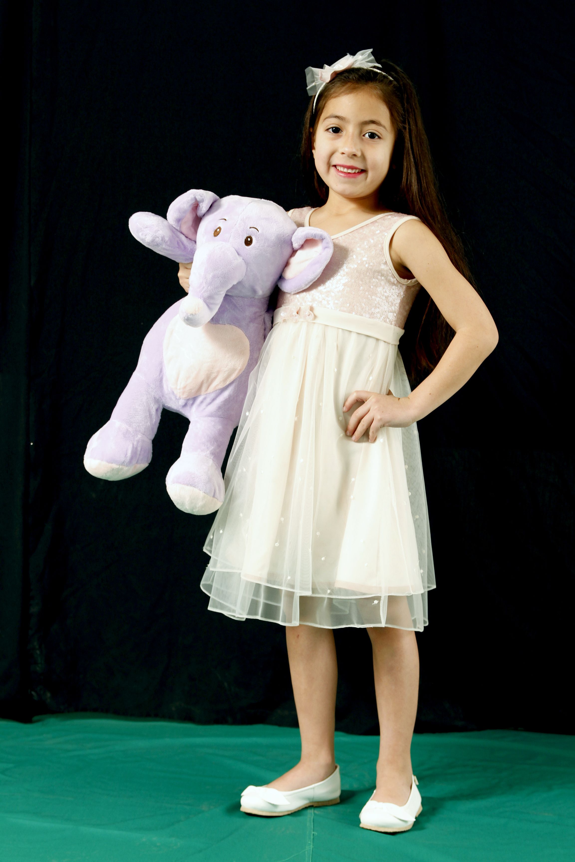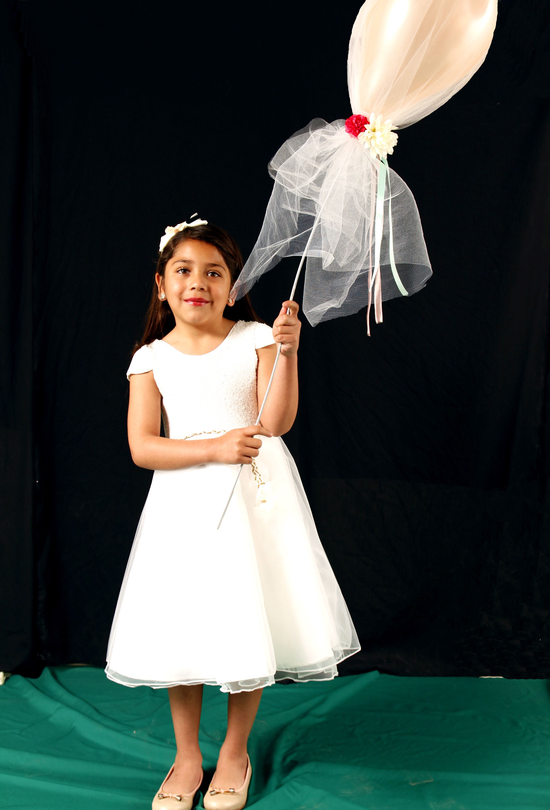 Josefina Contreras López con vestido de tul bordado con lentejuelas y en la espalda, con lazos forma un moño. Las mangas tienen vuelitos o alitas. Vincha con flor de tela.