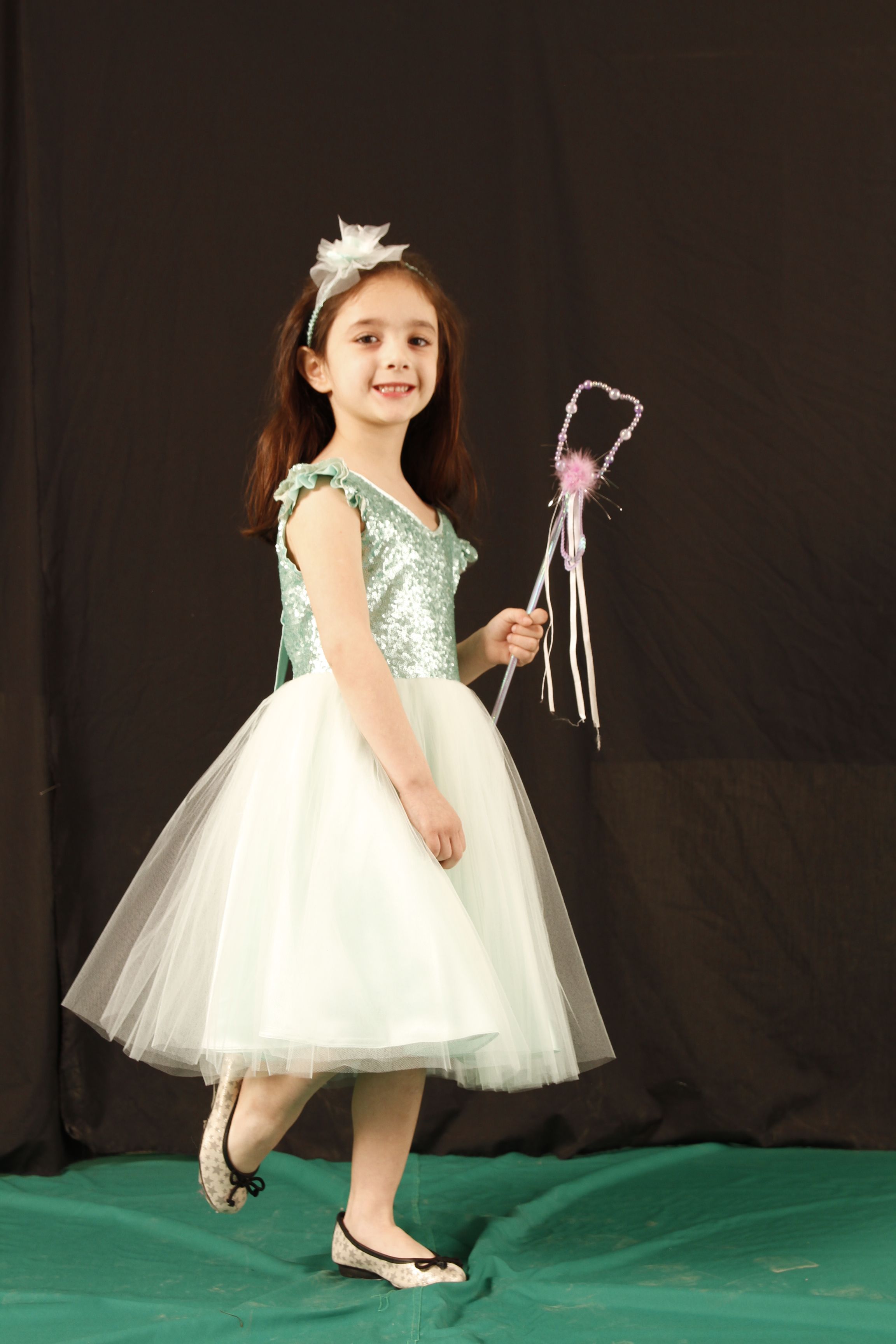 Guillermina Barquiel Yáñez y un vestido con talle a la cintura y escote redondo de tul bordado con lentejuelas verde agua. La espalda tene un diseño con lazos, formando un moño. La falda es de tul y tiene 3 capas de color natural y base de satén. En sus pies, guillerminas labradas, de cuero, con detalle de moño. Vincha con flores de tela y tules.