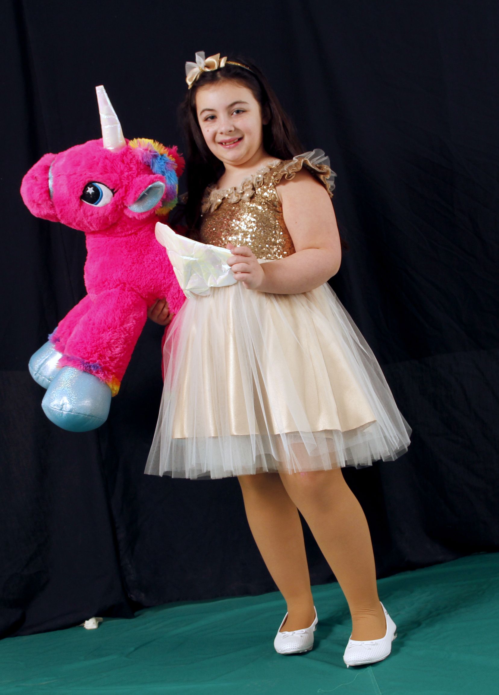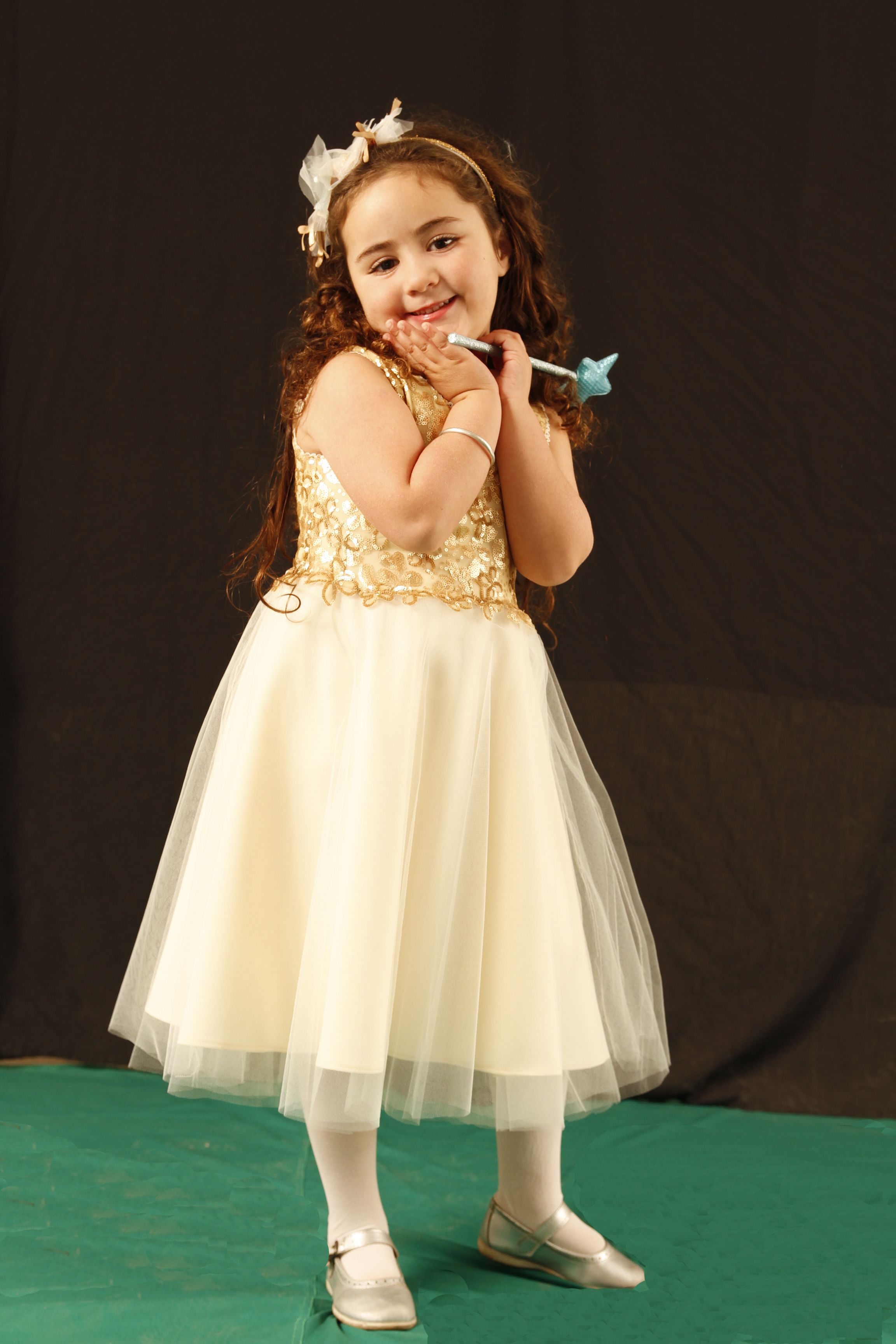 Maitena Plana Herrera vestido color dorado, con escote redondo de tul bordado con lentejuelas formando flores. La espalda es escotada y cierra con botones forrados. Amplia falda de tul color natural y base de crepe. En su cabecita ruluda, vincha con telas y cintas al tono.