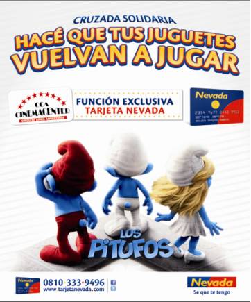 Tarjeta Nevada junto a Cinemacenter y el apoyo de siete comercios -Blaqué, Dismar Caucete, Electrovisión, Tecnocenter, Martinazzo Deportes, San Francisco Hogar y Baby Store-, llevaron a cabo la acción solidaria del Día del Niño en la que participaron más de 300 chicos en la función exclusiva de la película "Los Pitufos".