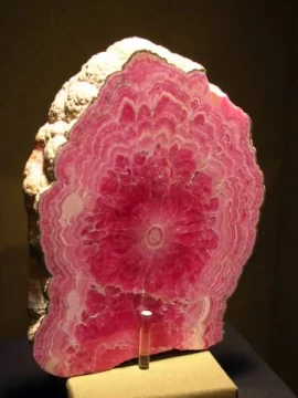 La rodocrosita Es un carbonato de manganeso de color rosado con distintas tonalidades, de claras a oscuras. Se presenta en cristales pequeños, redondeados, en drusas, en masas granulosas, espáticas, en agregados compactos, botroidales o estalactíticos. Clivaje perfecto. Frágil. Dureza: 4. Peso Específico: 3,3 – 3,6.