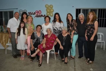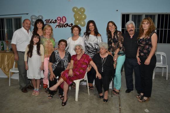 Alelí Francisca Pugliese alcanzó la novena década y lo festejó con una cena en familia y con amigos, en el Club San Isidro, en San Martín. Durante la comida, poco más de un centenar de invitados, disfrutaron del show musical que conforma la pareja imitadora de Los Pimpinella. Alelí es viuda de Osvaldo Martelli, comerciante, con quien tuvo tres hijos: Raúl Osvaldo (62), actualmente viviendo en Ushuaia, Tierra del Fuego y tiene cuatro hijos. Le sigue Ángela de Andino (60), con dos hijos. Por último, Ricardo (56), oficial de policía ya jubilado, casado con Nicolasa Bordón y seis hijos. A sus noventa años, Alelí contabiliza doce nietos y diez bisnietos. Le gusta ver televisión y juntarse con sus vecinas los sábados para jugar a la canasta o lotería. De espíritu muy vivo es una dama incansable. En la foto: José Chiaparo, Mirta Miranda, Amelia Pugliese, Verónica Miranda, María José Yanzón, Raúl Martelli y María Laura Avellaneda de Andino. Adelante, sentadas, Ángela Martelli, Nélida Pugliese y la cumpleañera, Alelí.