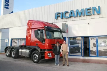 En la foto se observa la unidad Premium de la marca, un 740S46 6×4 con todos los opcionales adquiridos por Servimin S.R.L. que recibió Tito González y fue entregado por Edgardo André de Ficamen S.A.