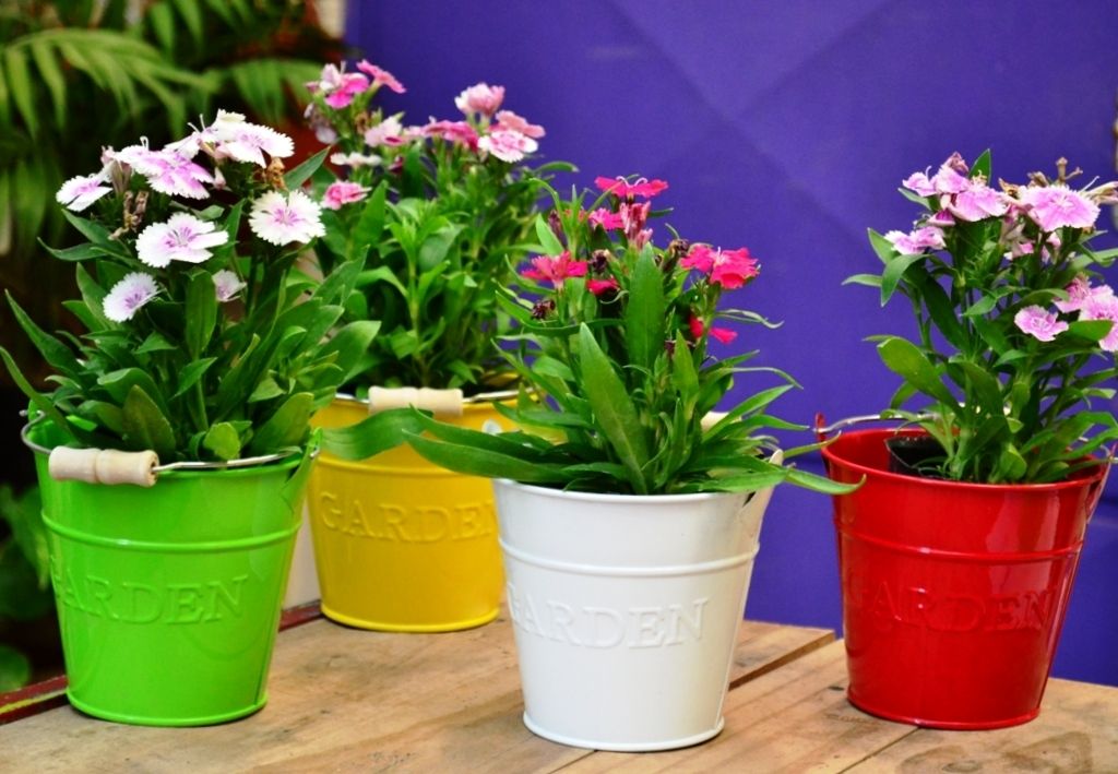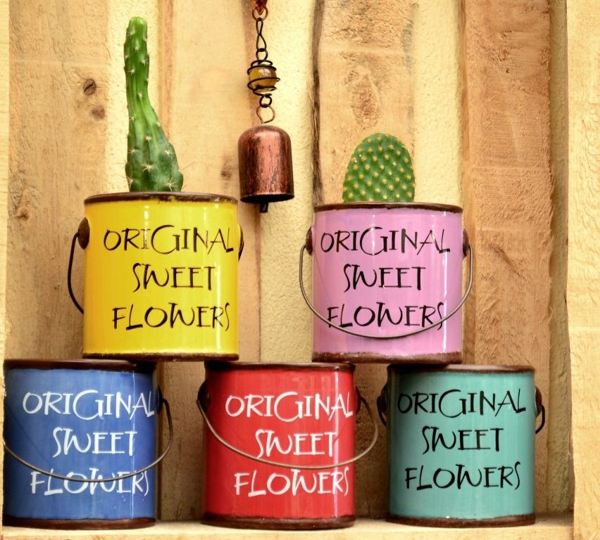 Baldes de lata de colores con plantín floral, $ 180