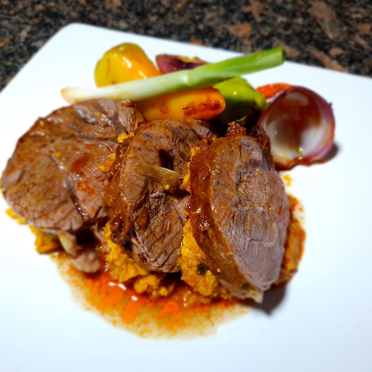 Para armar el plato: Disponer 2 o 3 filetes de osobuco intercalados con la humita y agregarle de guarnición los vegetales grillados o asados. Para finalizar salsear con el fondo de cocción del osobuco sobre los filetes.