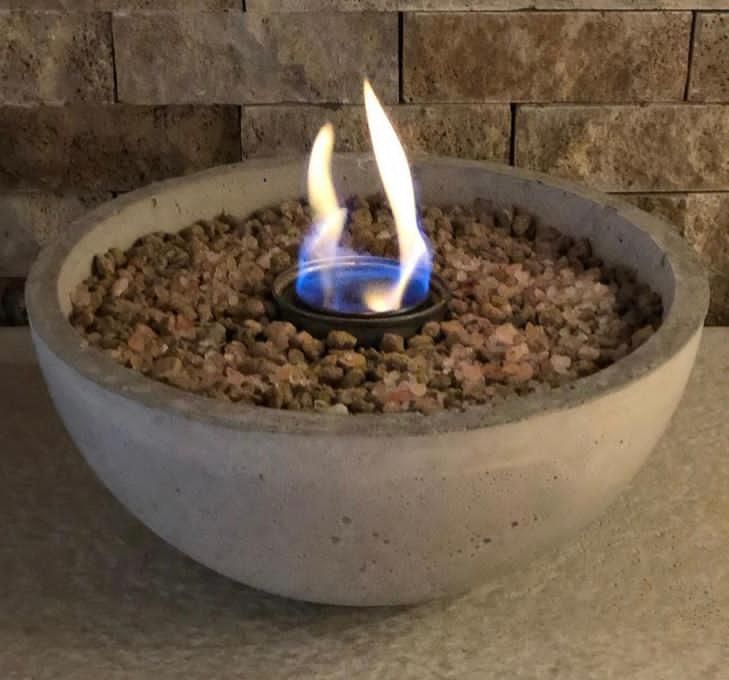 Fogoneros de cemento decorativos, de 16 y 28cm. Se utilizan con alcohol o bioetanol y se les puede agregar unas gotitas de aromas o citronela. Colores en gris o blanco relleno con piedras. $2.500 y $3.100 La autonomía va de 1 a 3 horas dependiendo del tamaño y cabe de 250 ml a 1 l de bioetanol o alcohol al 96%.