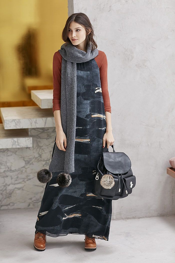 Complementos: Pashminas largas, bufandas con pompones, borcegos; gorros de lana, mochilas de cuero y abrigos overside.
