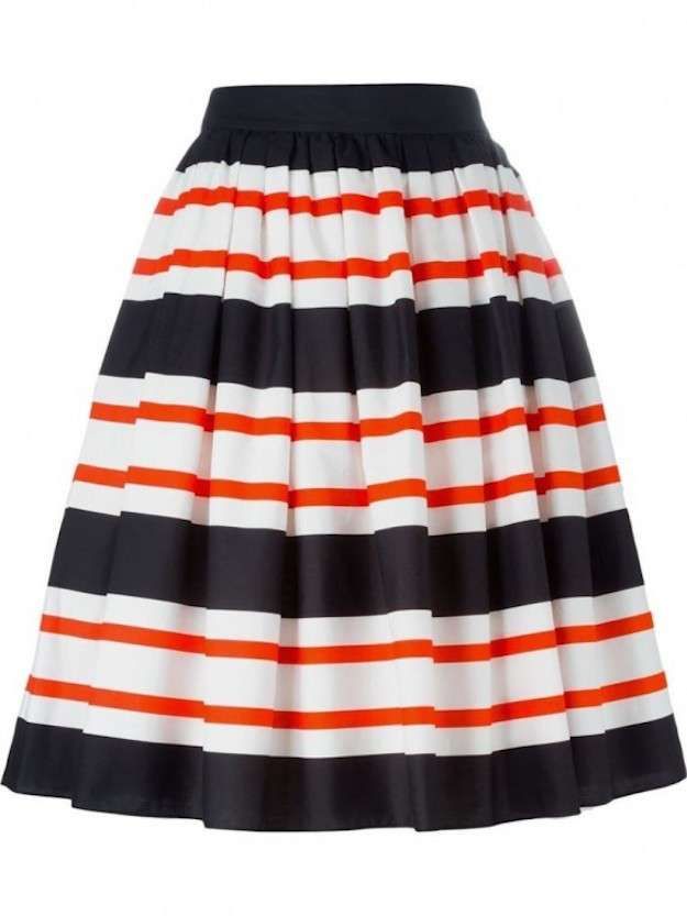 Las polleras a media pierna semi acampanadas o acampanadas, con cintura alta con camisas lisas o con rayas entalladas, de caída libre o con vuelos, crea un look ejecutivo ultra femenino.