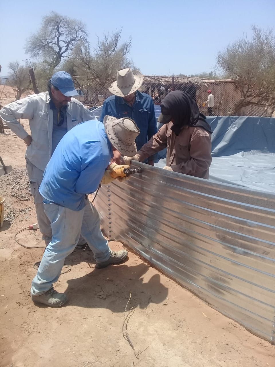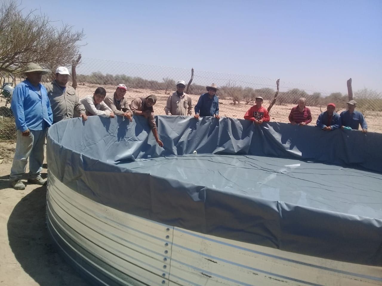Prosiguió "de ahí el agua va a los bebederos, a líneas de riego, canales y a un tanque australiano. Este último es de 50.000 litros, se arma con chapas curvas desmontables, y se impermeabiliza con una lona de pvc; no tiene piso, se limpia bien, se sacan las piedras, espinas, etc. Y ahí se vuelca el agua. Anteriormente, en las aguadas, la sanidad era dudosa, y el futuro más complicado para los animales, ahora es limpia el agua".